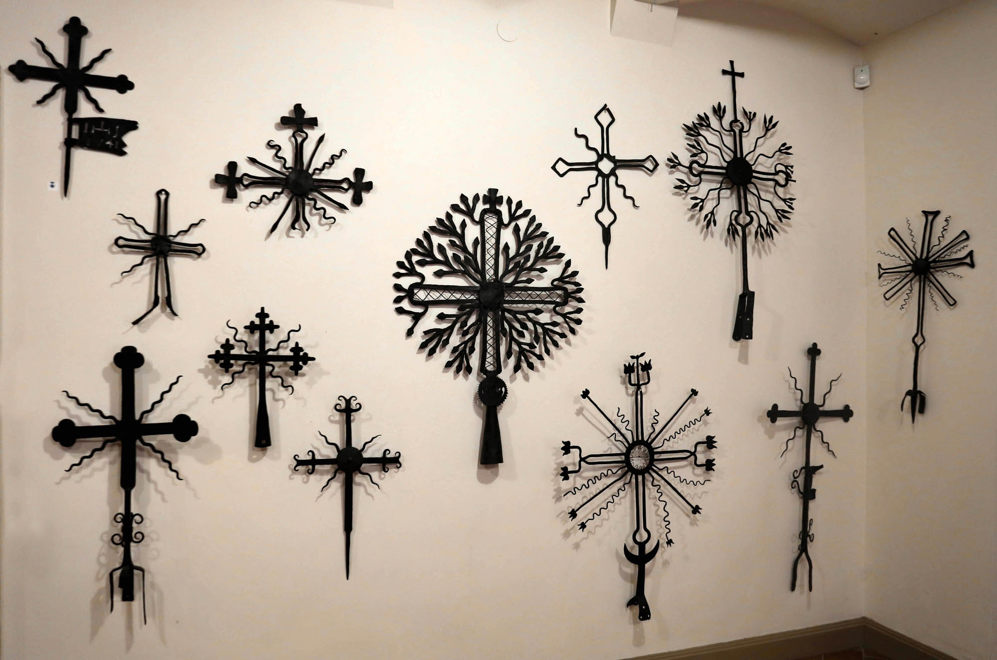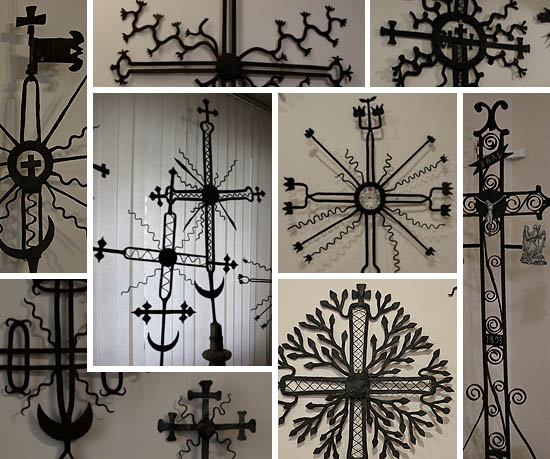 Kovové „sluneční kříže“, které korunují střešní sloupy – a často i kříže – dodnes odrážejí předkřesťanskou kosmologii. Dvě ramena kříže jsou dědici stromu života, který spojuje tři části světa; kolem něj Slunce (Saulė), zdroj života, které je v litevské mytologii ženské a každý večer se koupe v moři. Pod jeho diskem je Měsíc (Mėnuo), „otec“, který v noci střeží svět. Kolem nich rozptýlené hvězdy (žvaigždės) symbolizují osud.