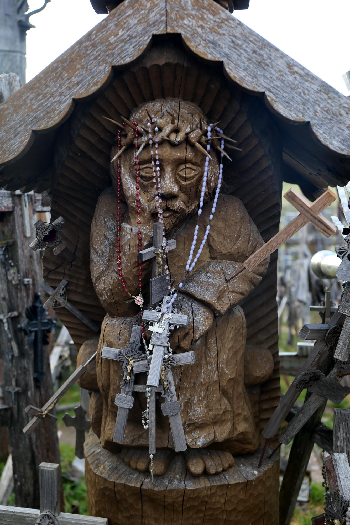 V důsledku spojení s křesťanstvím je dnes nejrozšířenější podobou těchto střešních sloupů v celé Litvě postava Krista známá v západní ikonografii jako Christus im Elend, zamyšlený Kristus nebo trpící Kristus: téměř nahý Kristus sedící s trnovou korunou, s hlavou opřenou o ruku. Tento typ vznikl od konce 14. století v německém prostředí jako sochařský protějšek častěji malovaného „Muže bolesti“. Jde o typický Andachtsbild, o němž jsem již psal: nejde o ilustraci biblického příběhu, ale o vysoce koncentrované, symbolické shrnutí – především událostí pašijí.