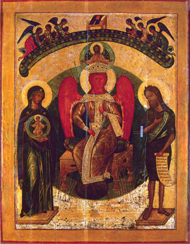 El primer tipo muestra a la Sabiduría como un ángel alado de fuego – огнекрылой – sentado en un trono, flanqueado por la Virgen María y Juan Bautista en actitud de súplica. Estos dos santos suelen aparecer junto al Pantocrátor en una pose similar, indicando que esta representación de la Sabiduría corresponde, según la tradición patrística, a Cristo (1 Cor 1:24, "Cristo, la Sabiduría de Dios"). Esto se puede ver en el icono de la catedral de Novgorod del siglo XVI, o incluso antes en el icono del siglo XV de la Catedral de la Anunciación de Moscú, que es una copia de un original de Novgorod ya perdido. La investigadora húngara Ágnes Kriza publicó recientemente un excelente monográfico sobre este tipo, * sobre el cual planeo escribir más detalles.