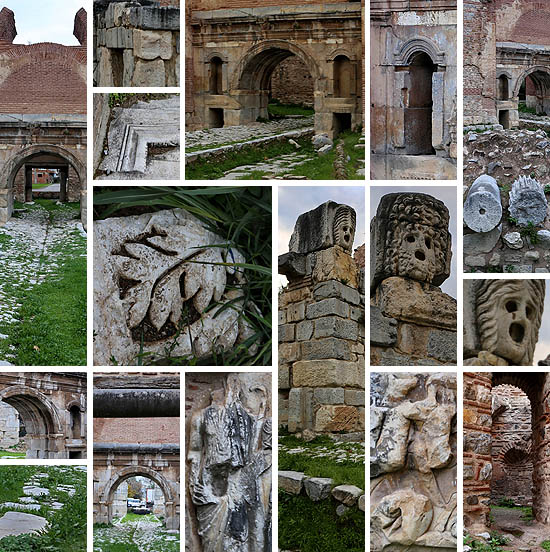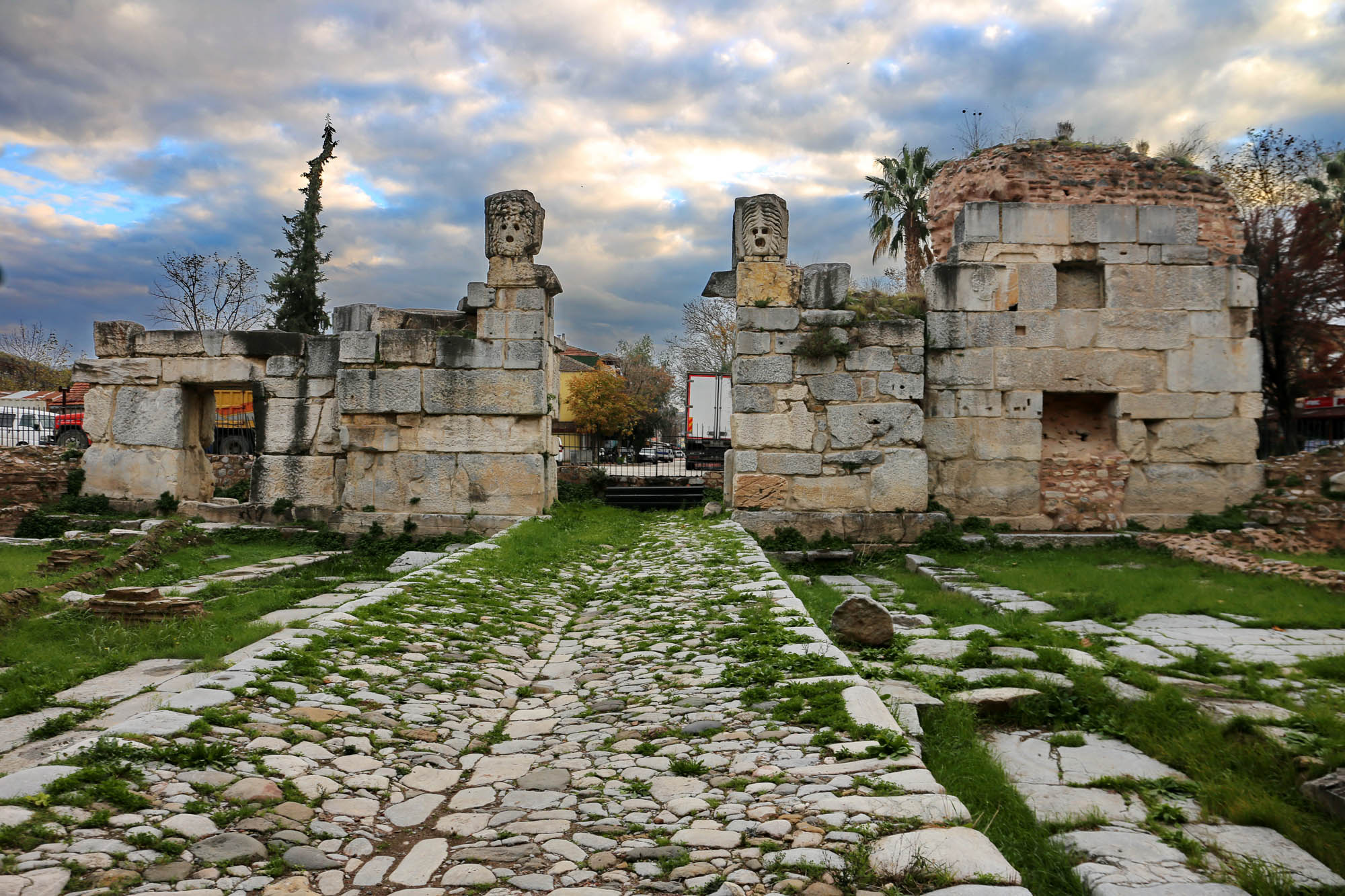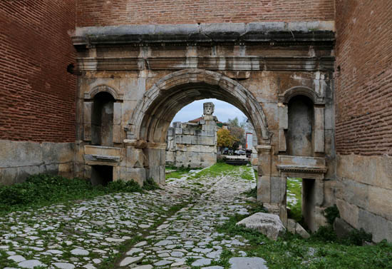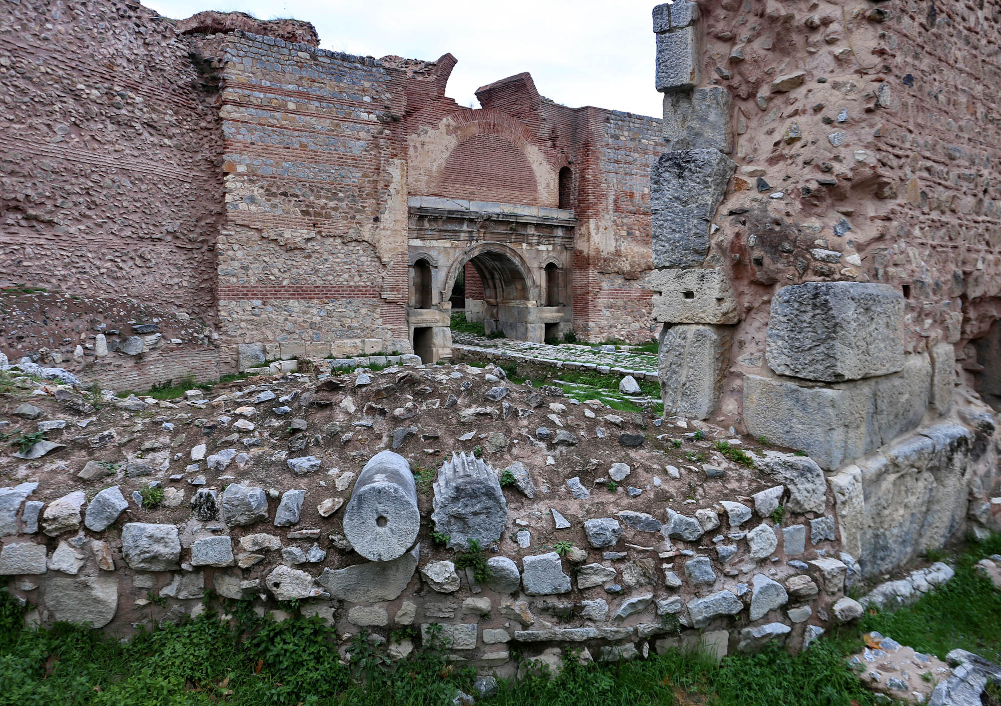 At the southern end of the decumanus opens the Yenişehir Gate, known in antiquity as Porta Neapolis, Πόρτα Νεάπολις. Like its northern counterpart, it began life as a triumphal arch and was later reinforced several times. Its 13th-century outer wall was equipped with a large circular bastion.