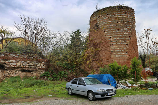 Here at the Lefke Gate, the aqueduct bringing water from the Bithynian hills entered the city. By the 19th century, the aqueduct was probably already in ruins, because in Charles Texier’s 1882 engraving, water is shown pouring from it. The puddle is still there today, with cars and motorcycles splashing through up to their bellies as they cross under the aqueduct.