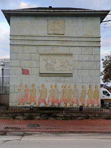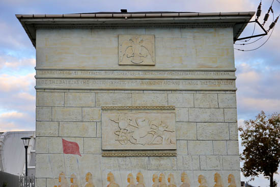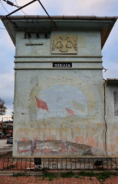 Next to the gate, on the other side of the road, stands one of the city’s most bewildering sights. The squat building – a transformer station – is topped with the double-headed Greek imperial eagle, lined with a two-row Greek inscription below, and at the very bottom, Turkish warriors with shields and helmets march in. You might think the Greek army of the 1920s built or at least painted it with royal Greek emblems and inscriptions, and that the Turks – with remarkable wit – didn’t destroy it, but rather made themselves part of the scene, marching into the Greek city.