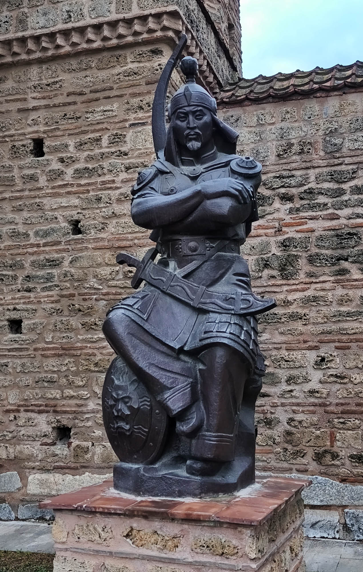 And just outside the Yenişehir Gate, there’s another monument dedicated to the conquest. A türbe with six green tombstones inside, covered with colorful Central Asian rugs. In front of the türbe stands a modern statue: a warrior with a Mongoloid face, fierce expression, and muscular arms crossed.