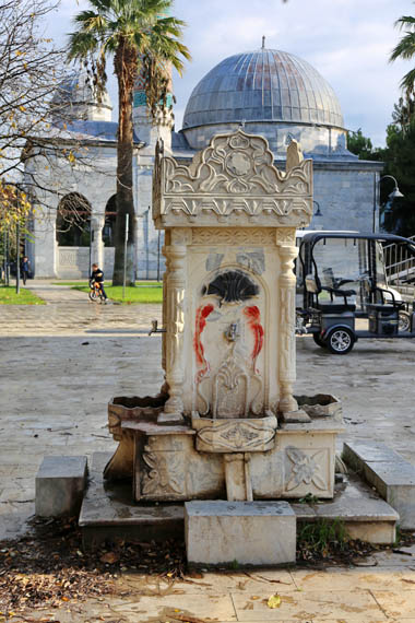 Sarı Saltuk Baba was a highly renowned 13th-century Alevi dervish, mentioned by both Ibn Battuta and Evliya Çelebi; according to the former he was a Crimean Tatar, according to the latter his original name was Mehmed and he came from Bukhara. He was especially popular in the Balkans, where he was seen as a key figure in Islamic missionary work. His story was told in a thousand versions, collected in the Saltukname. In many places he was identified with local Christian saints – in Corfu with Saint Spyridon, in Ohrid with Saint Naum – and the local Muslims venerated Sarı Saltuk at these graves. He also had his own tombs, for example in Babadag, Dobrudja, which became an important Muslim pilgrimage site, named Baba-Dağ, “Father’s Mountain,” after him. Here in İznik he also has a tomb. Perhaps it was established by Muslims resettled from the Balkans in 1924, but it is certainly popular among the locals. While we were there, two cars stopped, women got out, approached the tomb, and prayed.