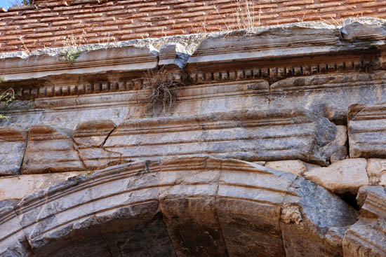 Continuing on, we reach the northern Istanbul Gate – Porta Constantinopolitana, Πόρτα Κωνσταντινουπόλεως. It was originally conceived as a triumphal arch-like ceremonial gate, but was later reinforced several times. In its 13th-century outer wall, two marble reliefs were reused as spolia, probably fragments of an earlier triumphal arch. Numerous other ancient architectural fragments can be seen scattered throughout the outer wall and around the fortifications.