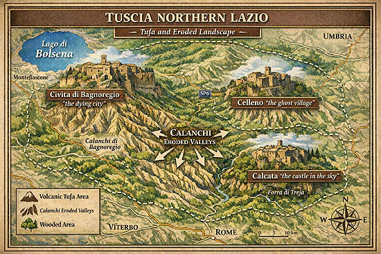 But in Northern Lazio’s Tuscia region there are several such towns. The geology of the area is peculiar: layers of clayey marine sediments are capped by volcanic formations, mainly tufa rock. Tufa is extremely vulnerable to erosion. Water seeps into its fissures, hollowing out cavities that eventually collapse. As the unstable ground shifts, cracks open along the edge of the cliff, which then begins to peel away in vertical layers. What once seemed like a brilliant idea – settling atop a naturally well-defended tufa cliff – gradually turns into the town’s slow disintegration.