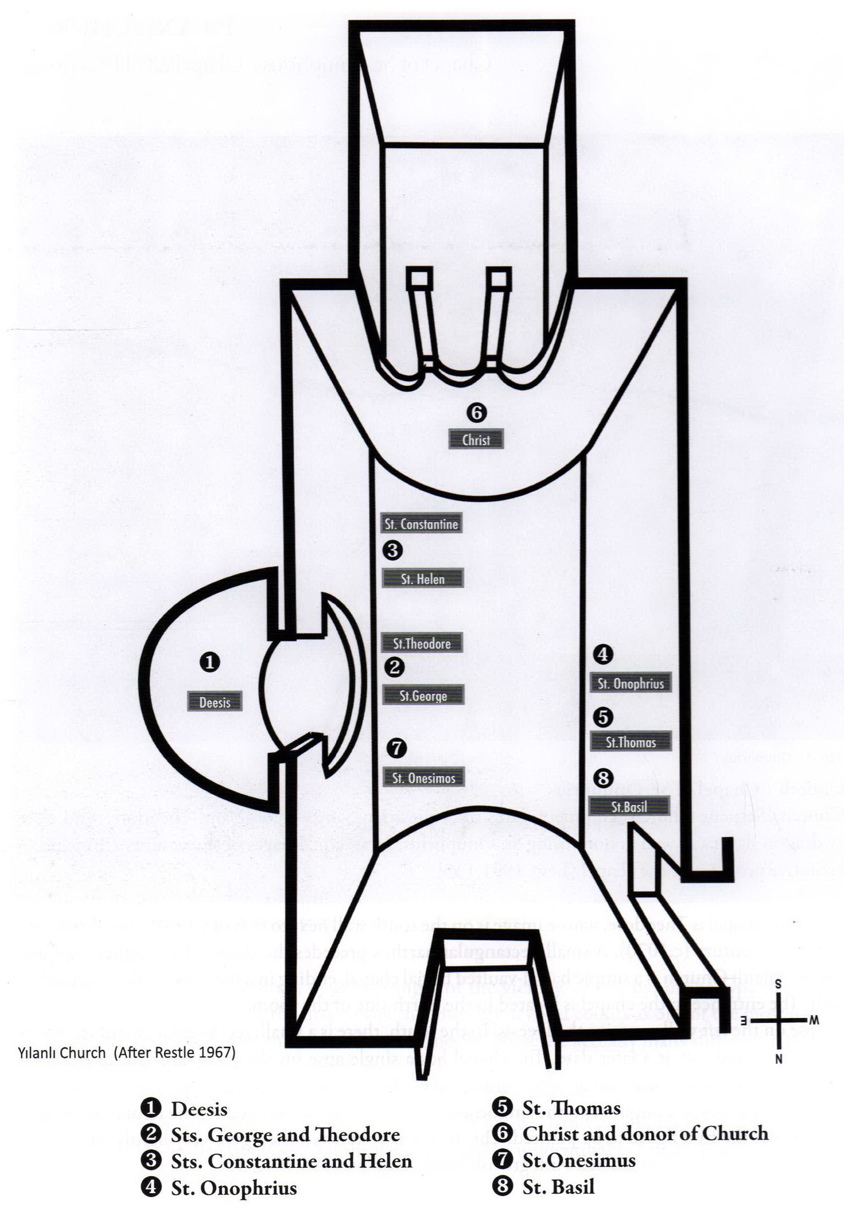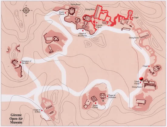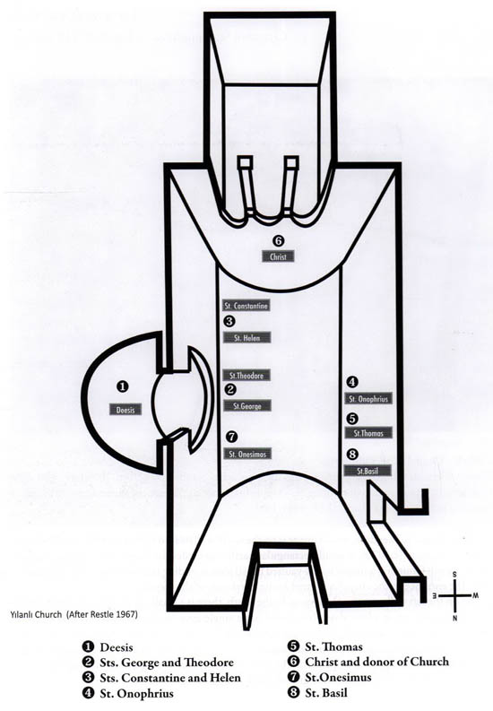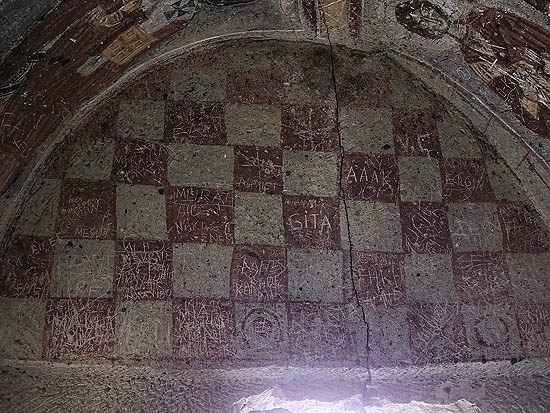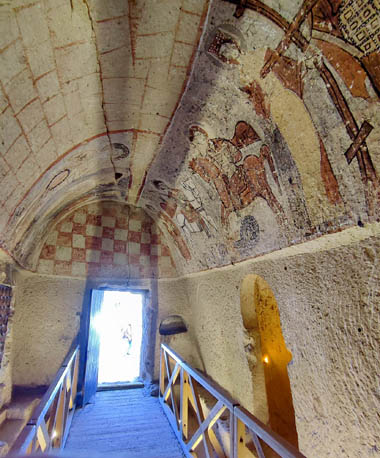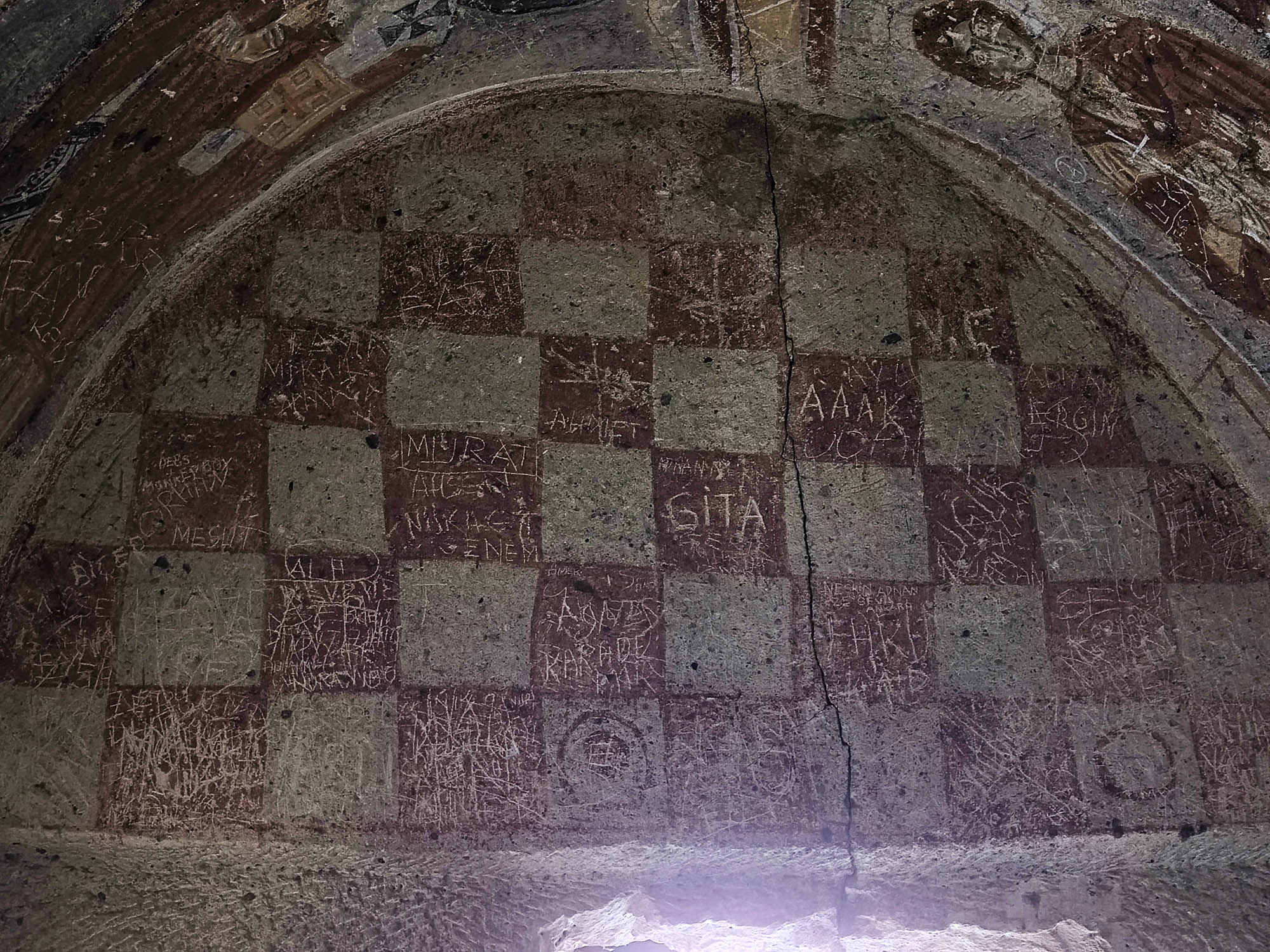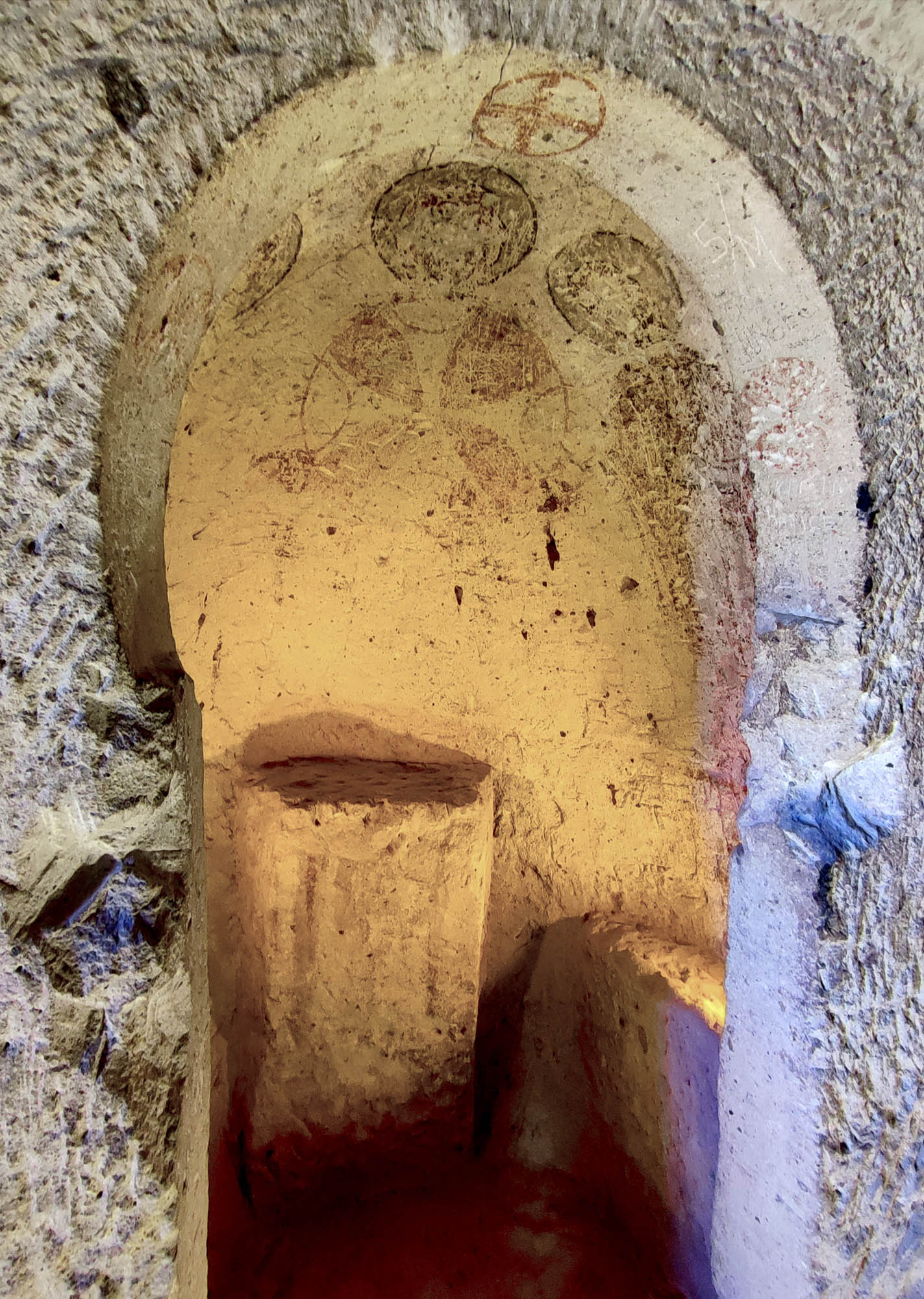 Göreme’s Snake Church is a simple barrel-vaulted chapel with an apse and altar on the eastern long side, giving it a cross-shaped, monastic layout, just like the nearby Saint Basil and Saint Barbara churches. The entrance on the shorter north wall is a side door, and directly opposite, a small chamber opens on the southern short wall, its floor dotted with graves.