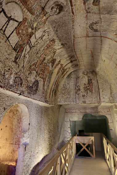 The lunette above the entrance is filled with a red checkerboard pattern. On the opposite lunette, above the tomb chamber entrance, Christ stands alongside a much smaller donor, Theodoros—perhaps he was interred in this same tomb.