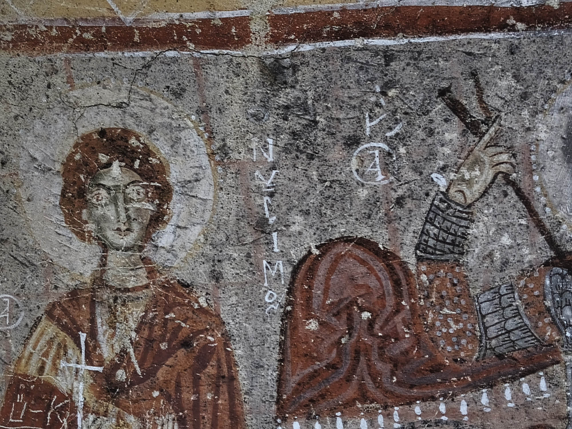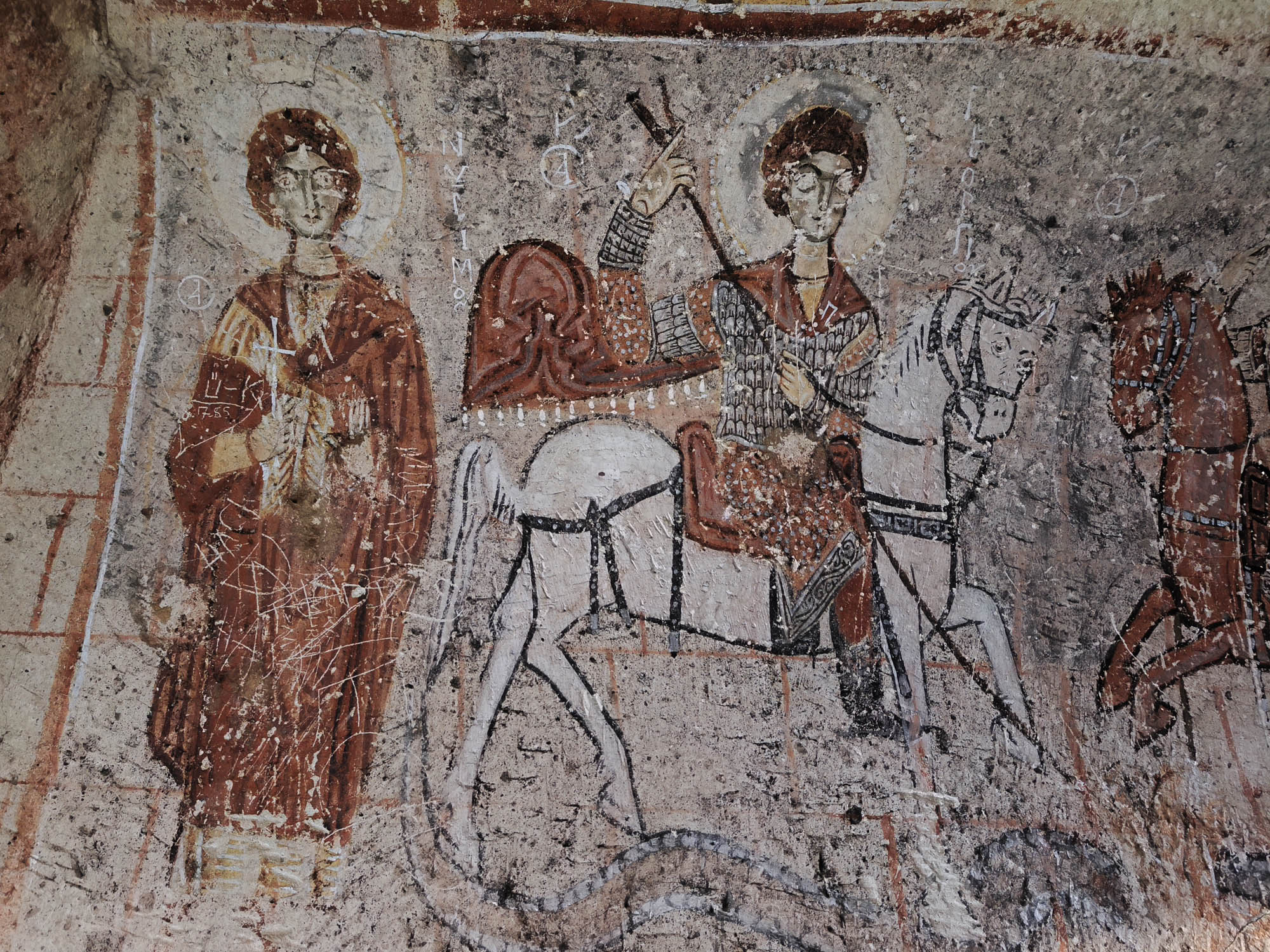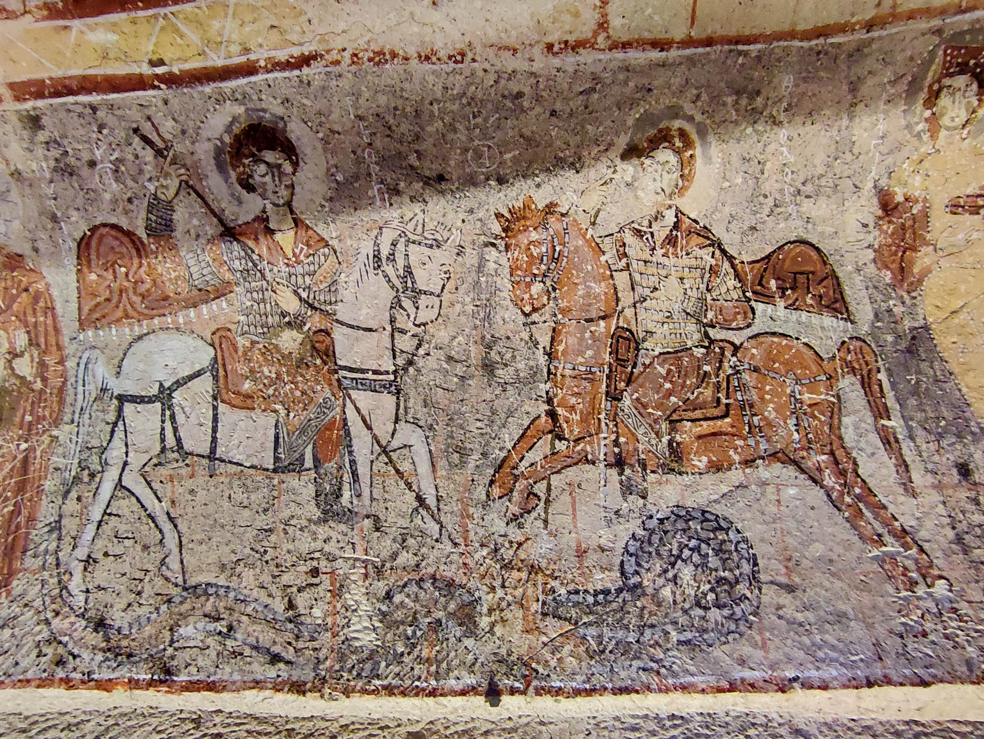 Along the eastern barrel vault stretches a single fresco panel. At its center, Saint George and Saint Theodore face each other on horseback, spearing a huge writhing dragon together. This is the earliest depiction of the duo in Cappadocia, dating to the mid-11th century—just over a century after the first dragon-slaying Saint Georges in Georgia.