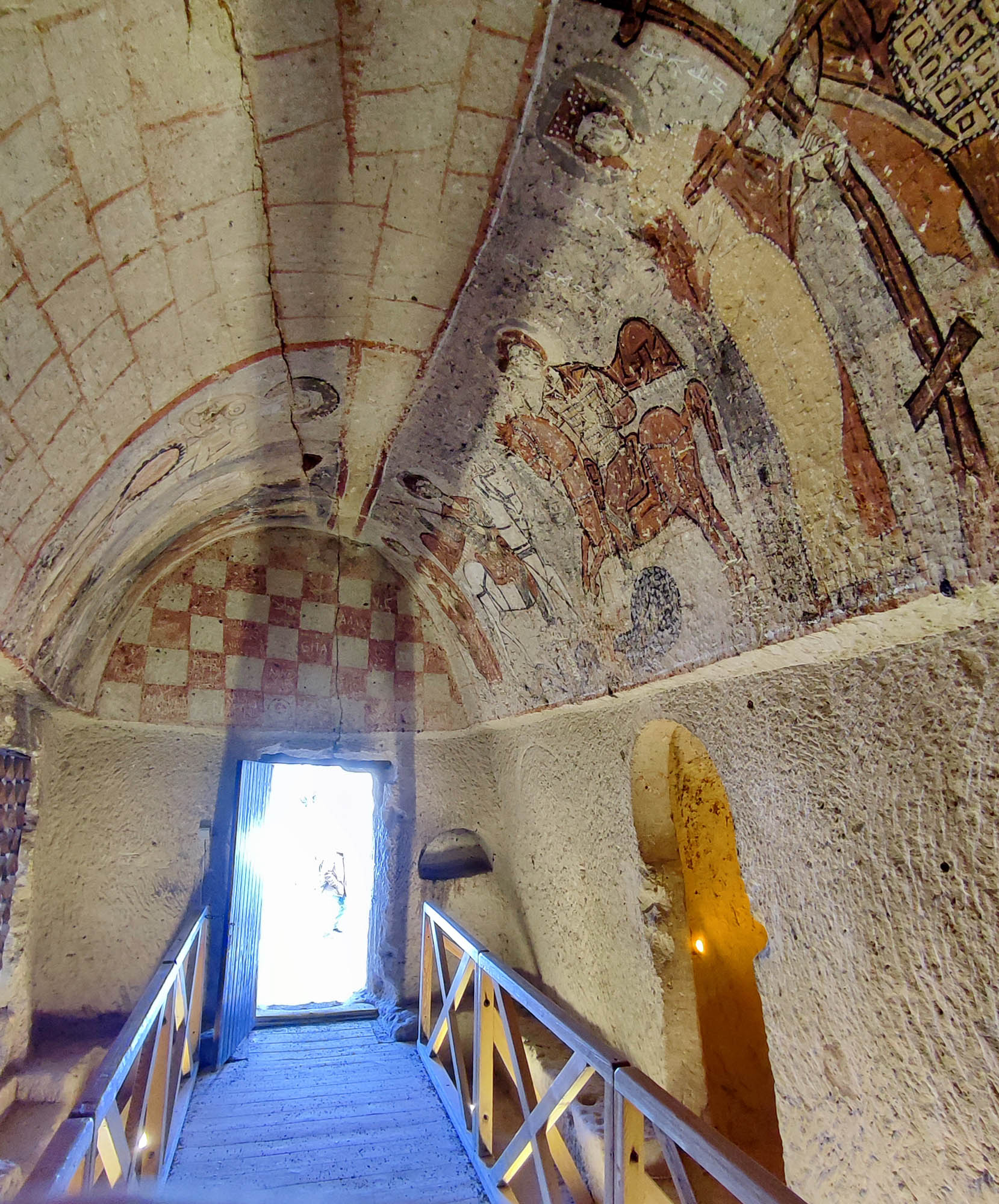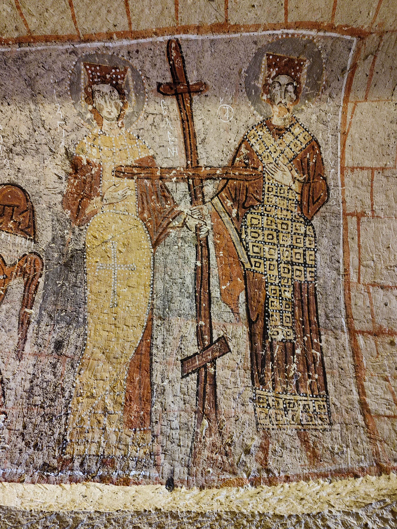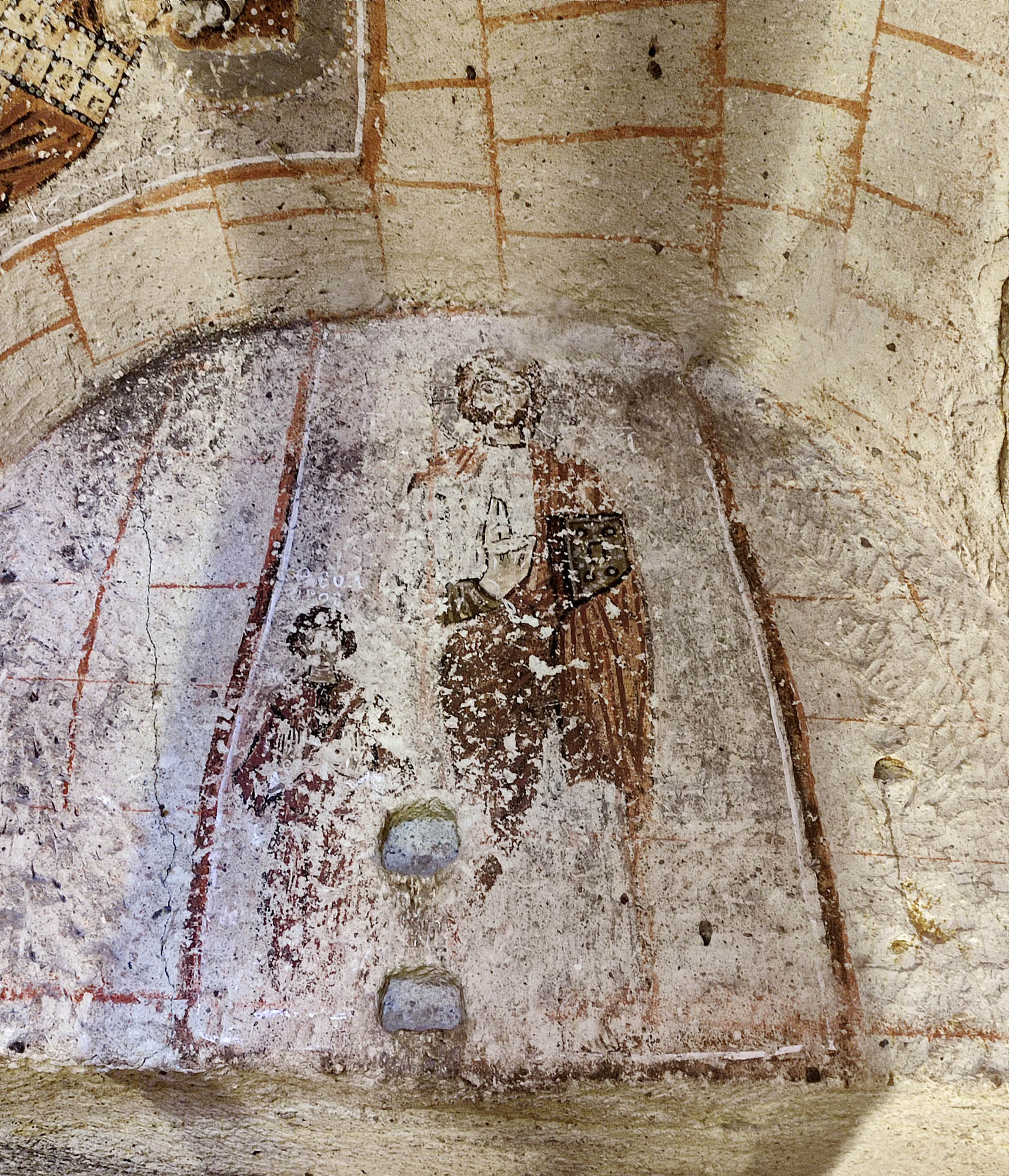 Along the eastern barrel vault stretches a single fresco panel. At its center, Saint George and Saint Theodore face each other on horseback, spearing a huge writhing dragon together. This is the earliest depiction of the duo in Cappadocia, dating to the mid-11th century—just over a century after the first dragon-slaying Saint Georges in Georgia.