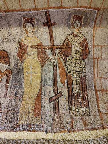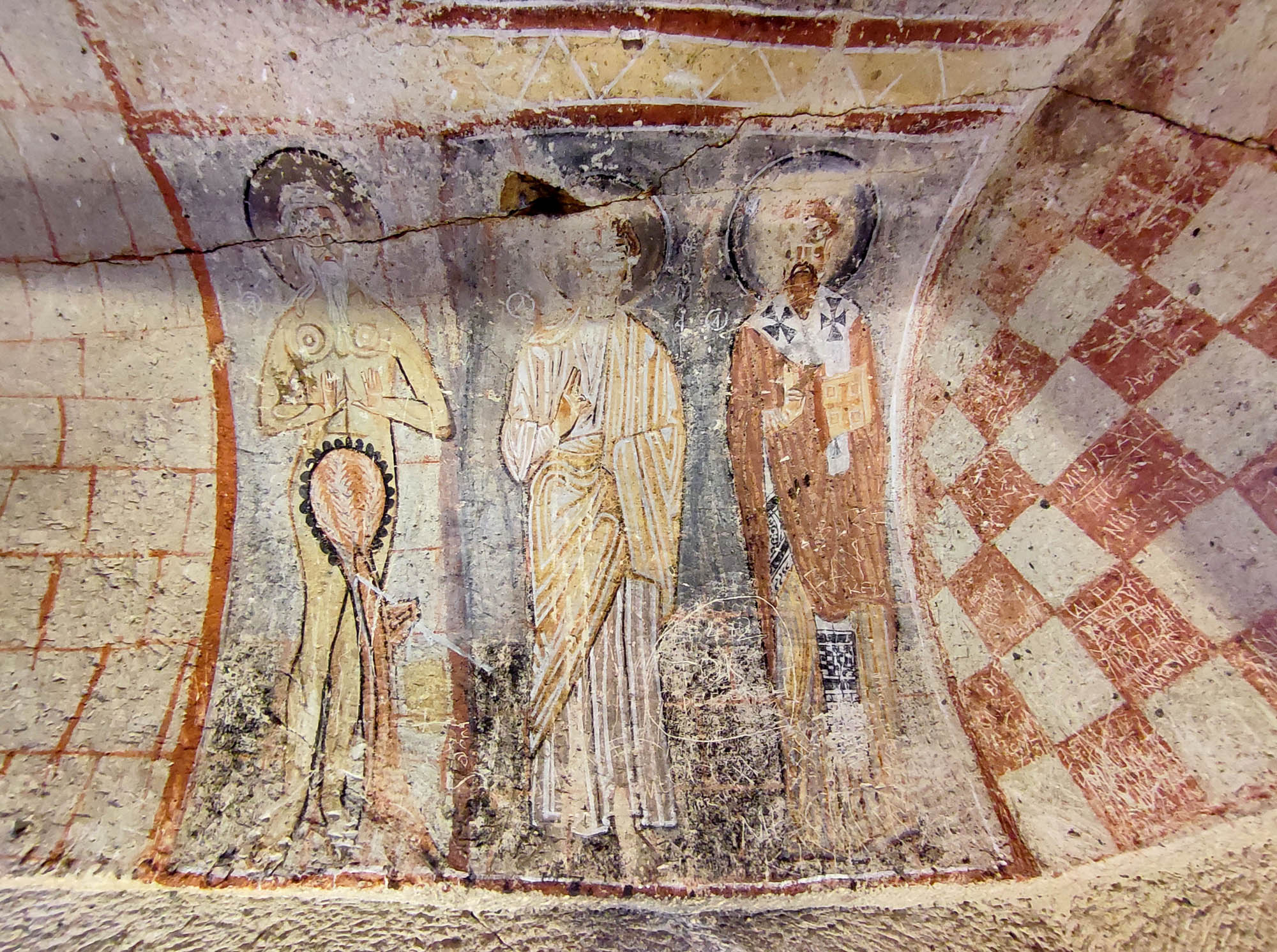 Across from this, on the western barrel vault, there’s only one fresco panel near the entrance, framed in red, depicting three male saints: Saint Onuphrius, the Egyptian hermit whose body is entirely covered by his floor-length hair; Saint Thomas the Apostle; and Saint Basil of Caesarea, founder of Eastern monasticism. Including the first and third saints is natural for a Cappadocian monastic chapel, while Saint Thomas might need a bit of explanation.