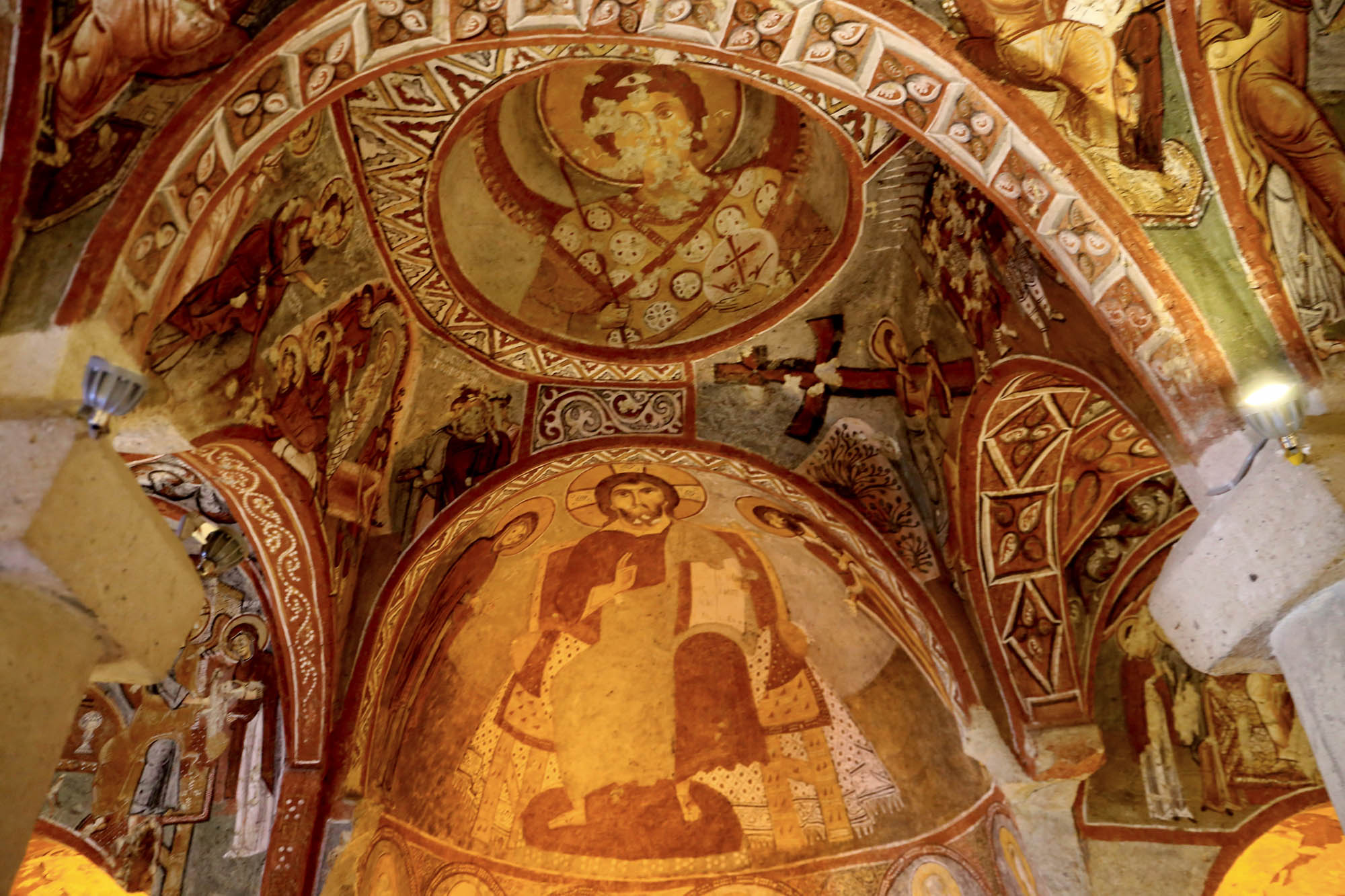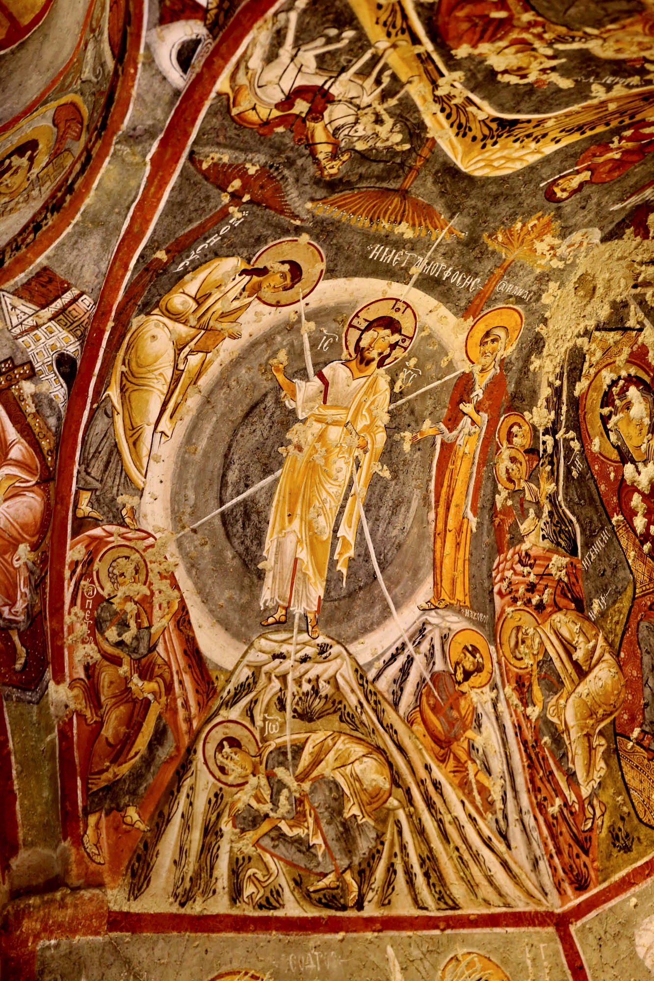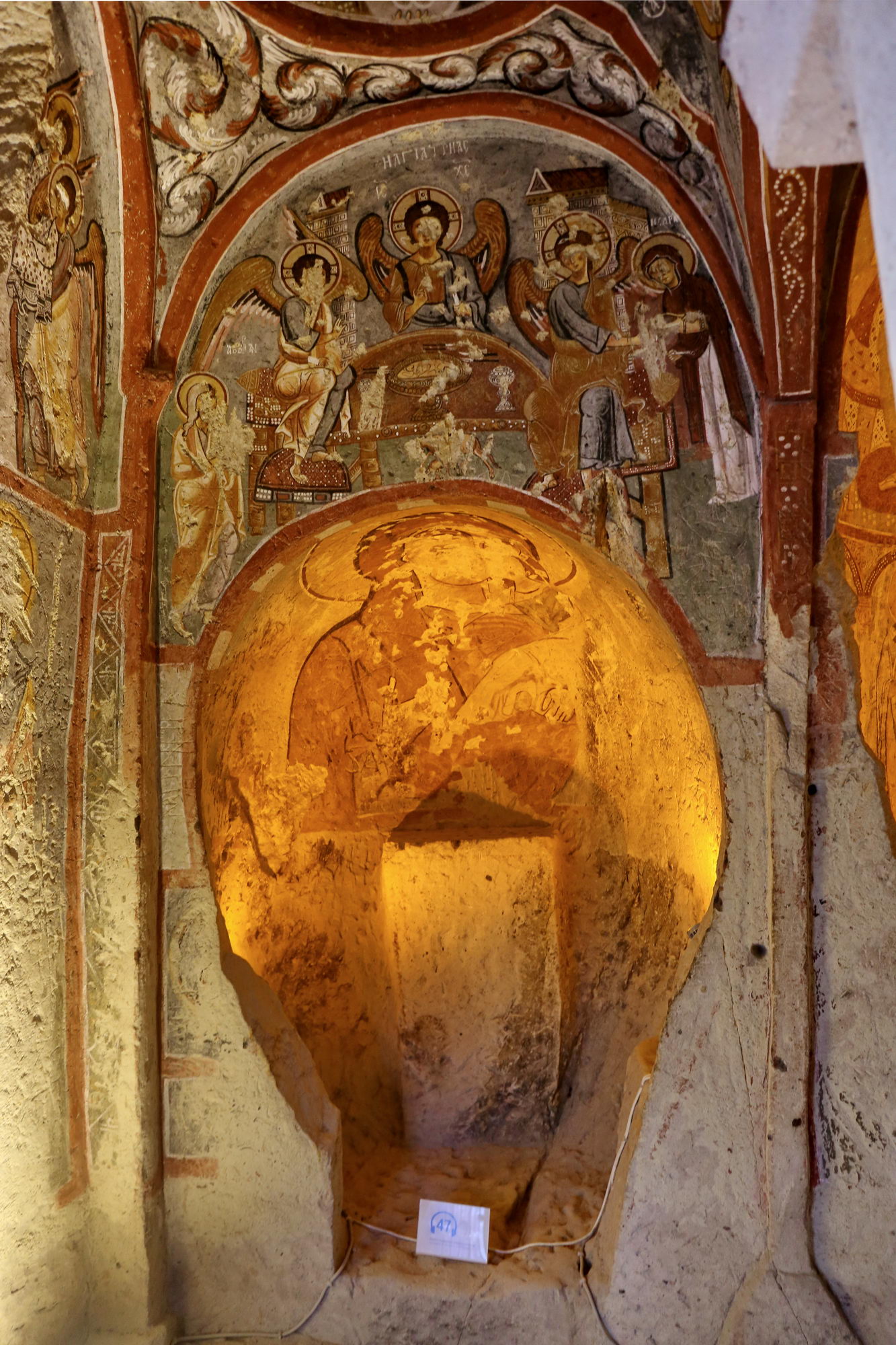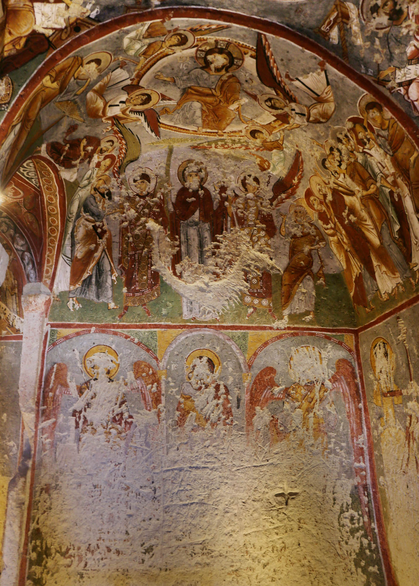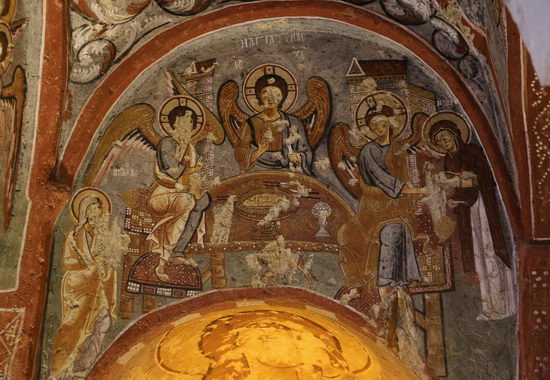 Like the other “four-column” churches — Elmalı, Karanlık and the church of Çavuşin — its entire interior surface is covered with frescoes, most likely painted by the same Constantinopolitan workshop that decorated the other three, again in the mid-11th century.