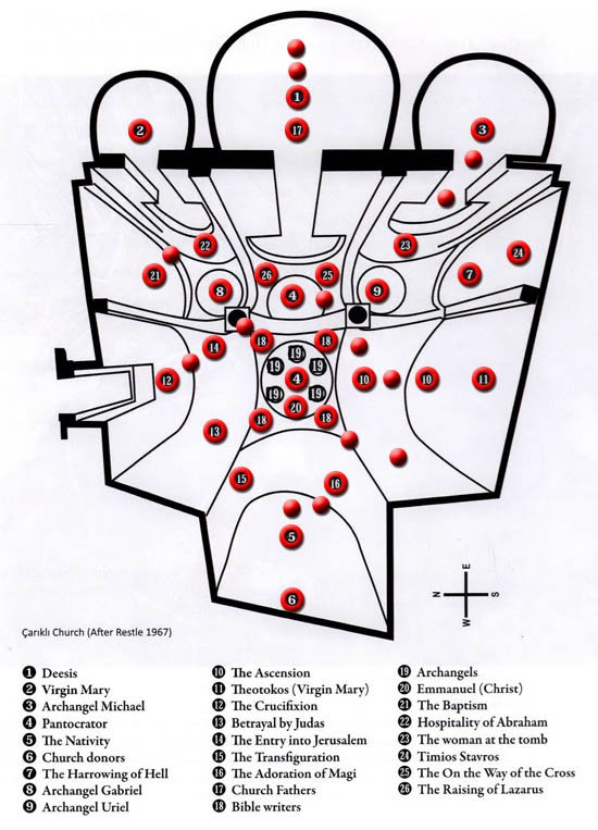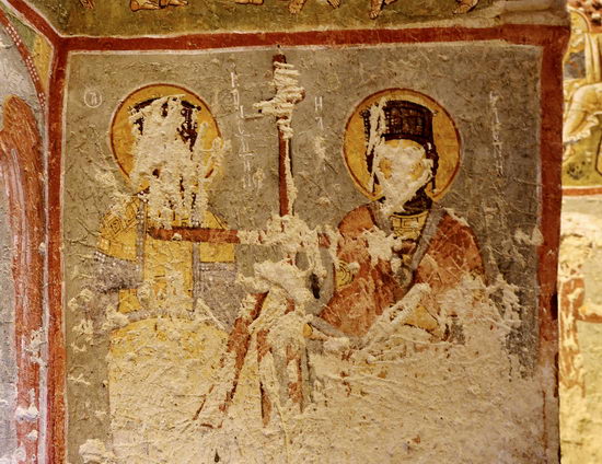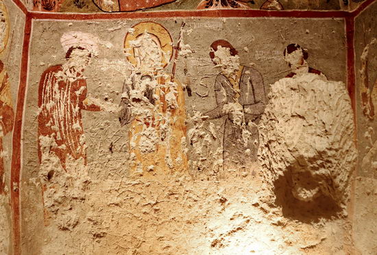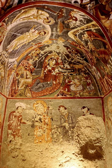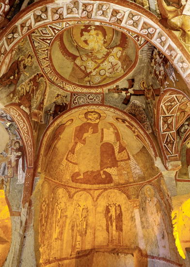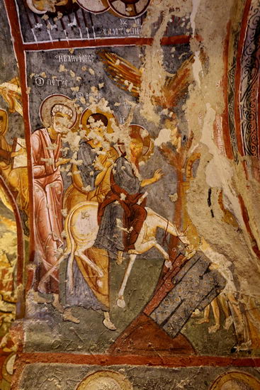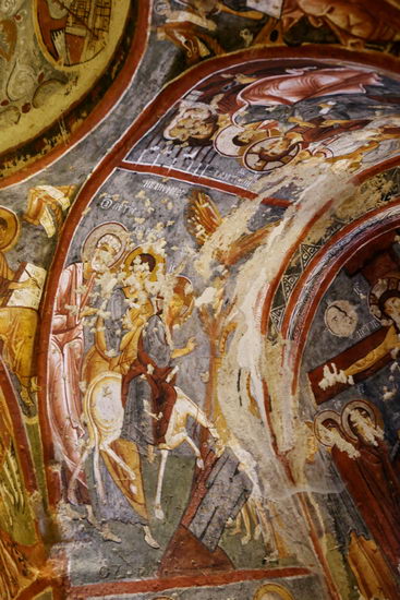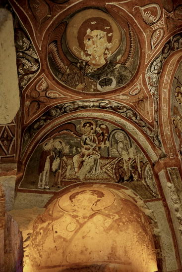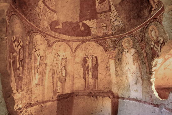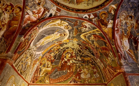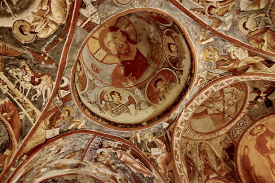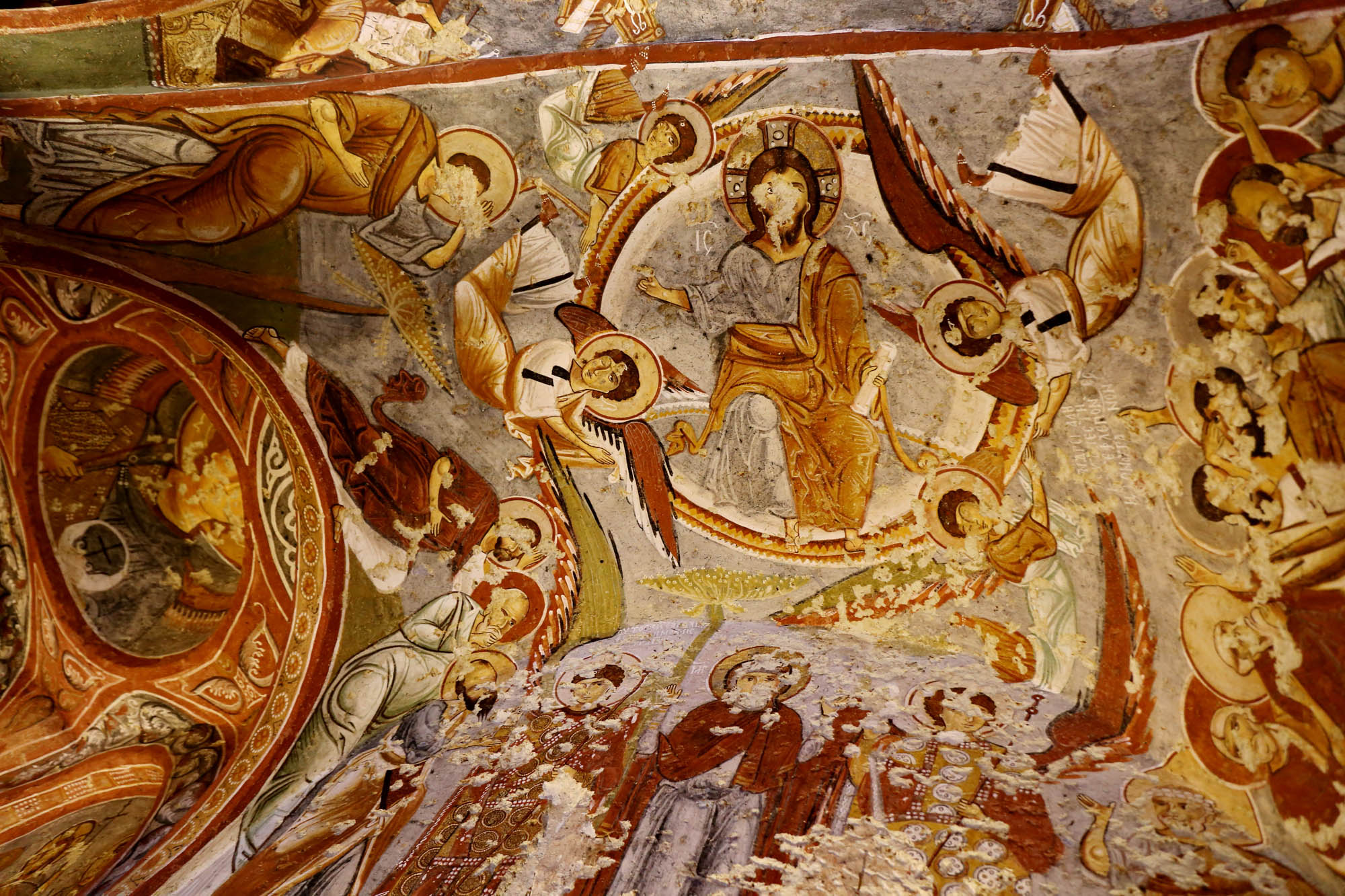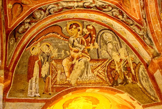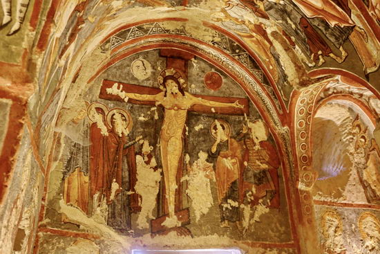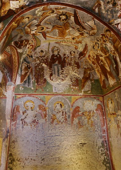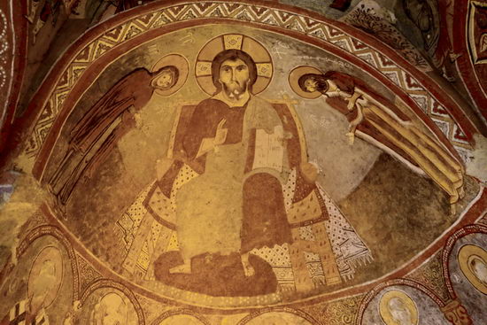 Like the other “four-column” churches — Elmalı, Karanlık and the church of Çavuşin — its entire interior surface is covered with frescoes, most likely painted by the same Constantinopolitan workshop that decorated the other three, again in the mid-11th century.