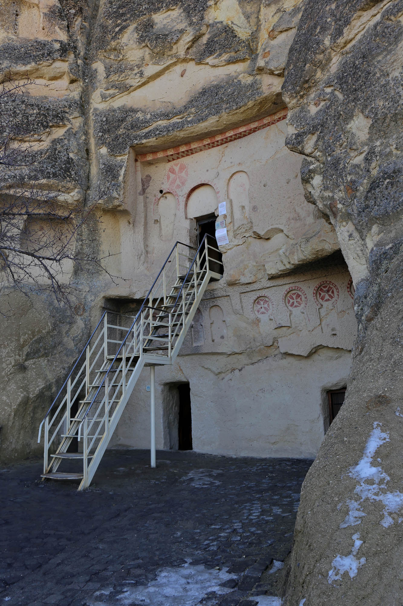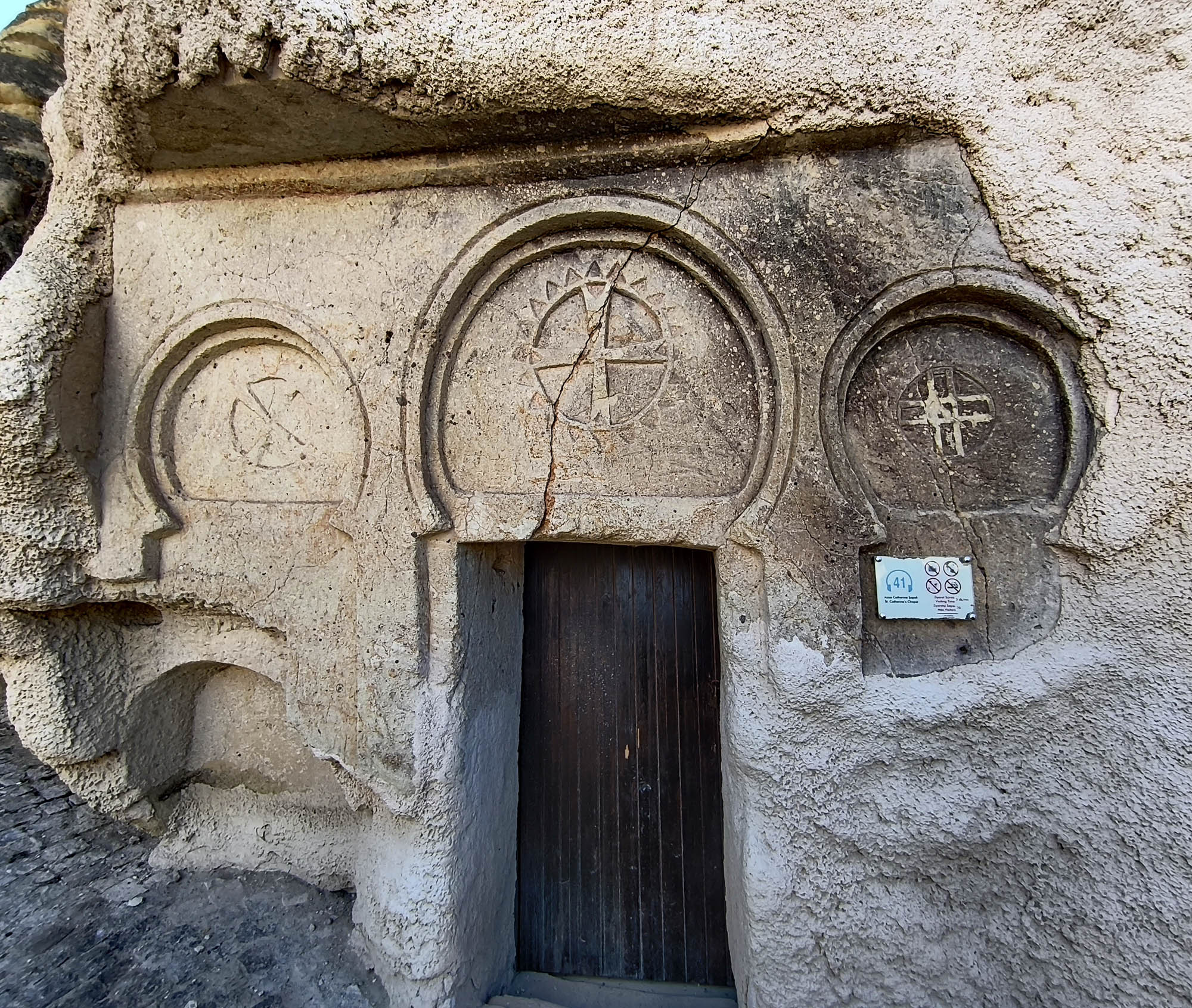 The eighth church of Göreme, dedicated to Saint Catherine, is decorated with 11th-century icon frescoes arranged almost like a patchwork: Christ Pantokrator, the Mandylion, archangels and soldier saints — among them Saint George on horseback — as well as the church’s namesake, Saint Catherine herself. However, much like the Elmalı Chapel, this church is permanently closed to visitors; only the three carved crosses framed in circles above the doorway can be seen.