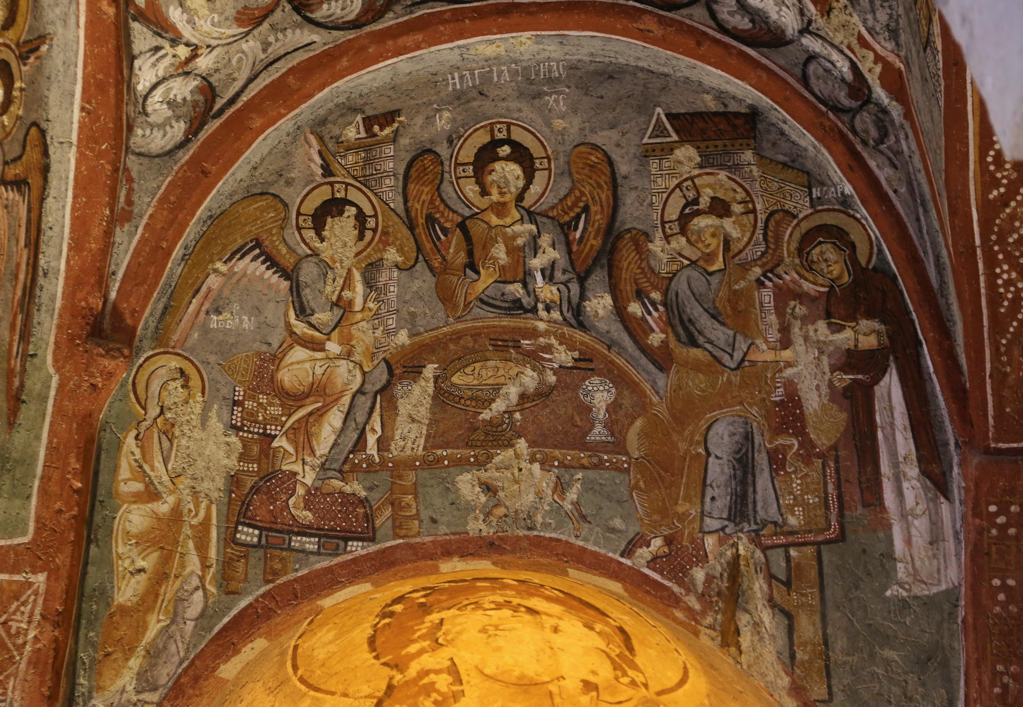 In the two side apses: the Theotokos with Child, and the half-figure of Archangel Michael. In their frontal lunettes: Abraham’s hospitality to the three angels—emphasizing its Eucharistic typology here as in the San Vitale of Ravenna—and the Women at the Tomb. In the latter, the folded shroud is again depicted in a compressed form, as in the Karanlık Church, indicating that both chapels were painted by the same workshop.