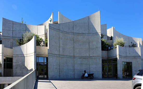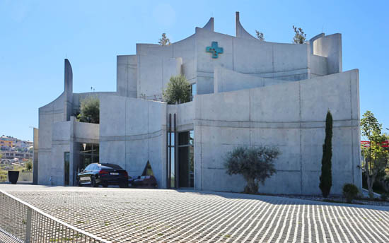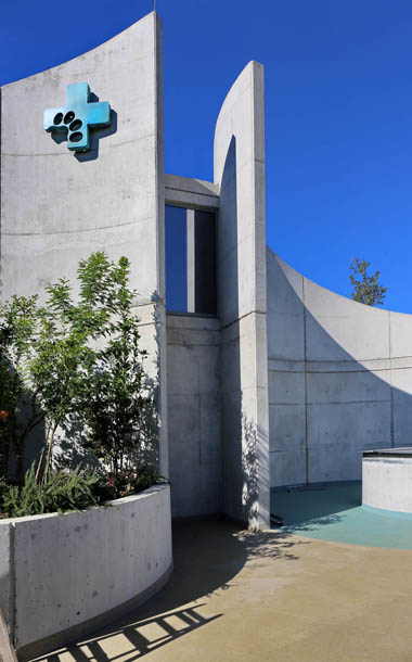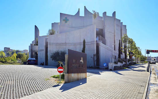 Ahora vemos, y el mapa también lo confirma, que no es una iglesia, sino un hospital: un hospital veterinario. Pero también así su forma sigue siendo muy original. Las paredes de hormigón cóncavas no encierran el edificio, sino más bien lo dibujan, rodeándolo como velas que envuelven un barco. Entre estas «velas», aparece aquí y allá el cuerpo del edificio, con cornisas rectas de líneas irregulares y grandes paredes de vidrio, contrastando con las formas curvas, y una «cubierta» desde la que asoman pequeños granados y olivos.