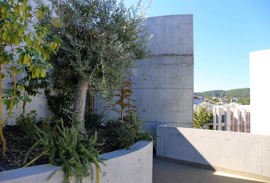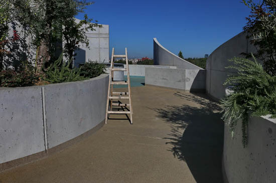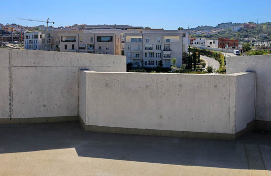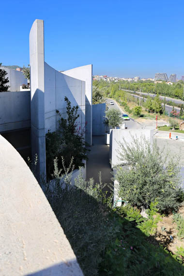 Las dos terrazas de la azotea también están definidas por las velas cóncavas, que envuelven unos parterres elevadas y las conectan con el entorno. Ahora se ve claramente que el hormigón no fue una elección arbitraria, sino que armoniza con los edificios circundantes. Estamos en uno de los barrios más elegantes de Tirana, rodeado de suaves colinas y modernos complejos residenciales. En la zona, varias empresas de arquitectura internacional han levantado edificios llamativos. El hospital encaja perfectamente, pero al mismo tiempo destaca por sus formas curvas, como si fuera una enorme escultura de Henry Moore en medio de la plaza.