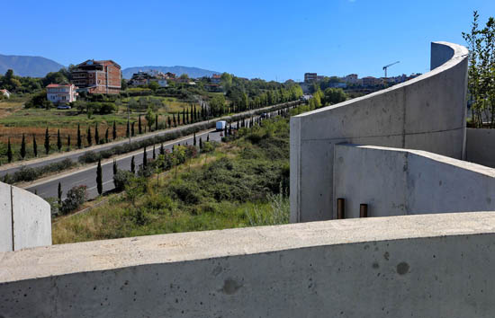 Emre participó personalmente en el diseño, consultando y evaluando los planos del arquitecto. «Originalmente el edificio no iba a ser así, sino lleno de ventanas», muestra en su móvil. «Como un gran queso emmental. Así que le pedí a Davide que eliminara las ventanas.» De este modo surgió el edificio actual, sólido y de aspecto fortificado, cuyo brutalismo encaja sorprendentemente con la tradición arquitectónica reciente de Albania. Pero las formas redondeadas suavizan ese brutalismo, recordando al modernismo orgánico de Alvar Aalto, a los edificios de hormigón curvo de Oscar Niemeyer o a los trabajos tardíos de Le Corbusier, como la capilla de Ronchamp.