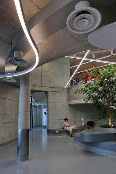El diseño se encargó a la firma suiza de Davide Macullo. Vale la pena visitar su página, porque muestran el hospital con fotos mucho más bellas de las que yo pude tomar durante nuestra breve visita, intentando no molestar al médico ni fotografiar mis compañeros que se dispersaban por el espacio.