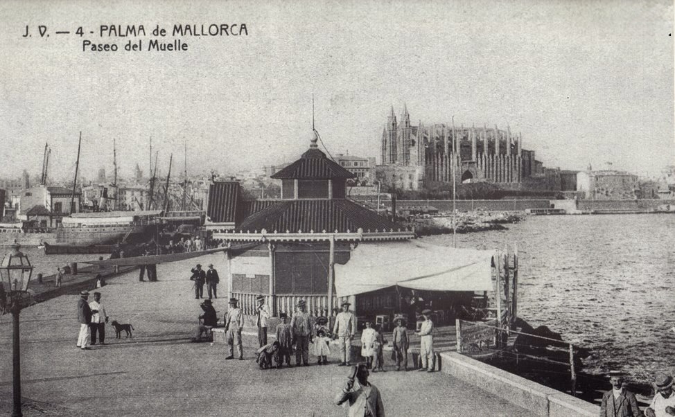 El dique que construyeron delante del palacio de la Almudaina se fue convirtiendo poco a poco en el «Passeig de la Riba» un lugar favorito del los palmesanos porque era continuación, mar adentro, del Born. Pronto le añadieron un kiosco que se hizo muy popular como lugar de encuentro (abajo). Hoy los autobuses trasladan hasta aquí a los turistas que llegan en los cruceros para empezar la visita a la ciudad. Esta foto está tomada donde ahora está el bar Varadero.