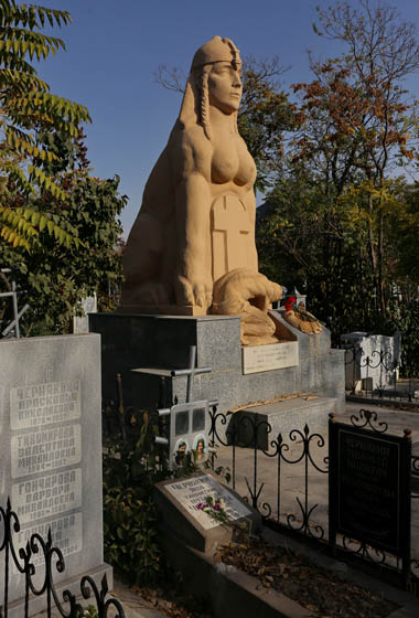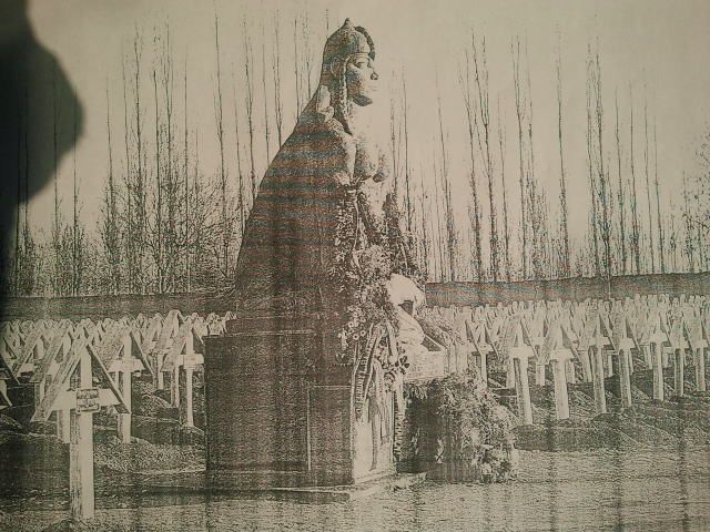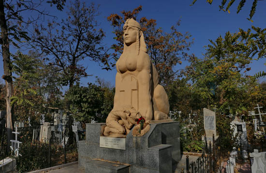 A los pies de la esfinge, un soldado con el torso desnudo —pero con gorra según las normas— se inclina sobre el suelo llorando a sus camaradas. Delante de él hay una corona de tumba tallada, con algunas flores secas y un ramo fresco de flores rojas que he colocado aquí en memoria de mi abuelo, prisionero en Siberia durante la Primera Guerra Mundial.