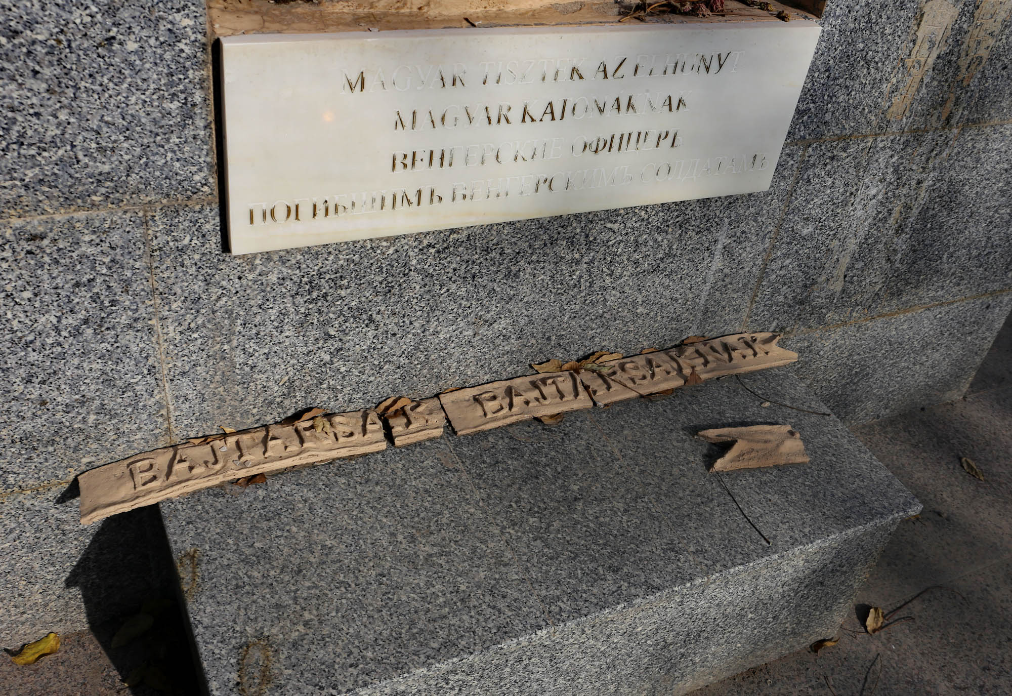 La lápida tiene inscripciones en húngaro y ruso: MAGYAR TISZTEK AZ ELHUNYT MAGYAR KATONÁKNAK (Oficiales húngaros para los soldados húngaros) – ВЕНГЕРСКИЕ ОФИЦЕРЪ ВЕНГЕРСКИМЪ СОЛДАТАМЪ. En la inscripción evidentemente nueva, escrita con ortografía antigua —probablemente copiada de una placa anterior—, la letra final dura en ОФИЦЕРЪ idealmente sería Ы para indicar el plural «oficiales». Bajo la placa de mármol yace la original de barro rota: BAJTÁRSAK BAJTÁRSAKNAK (Camaradas a camaradas).