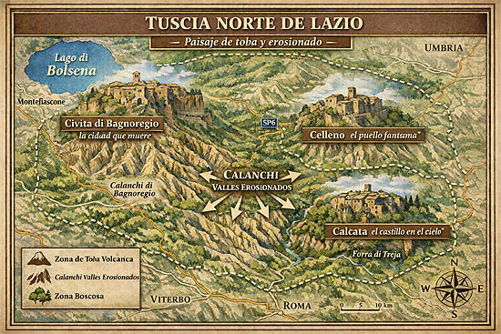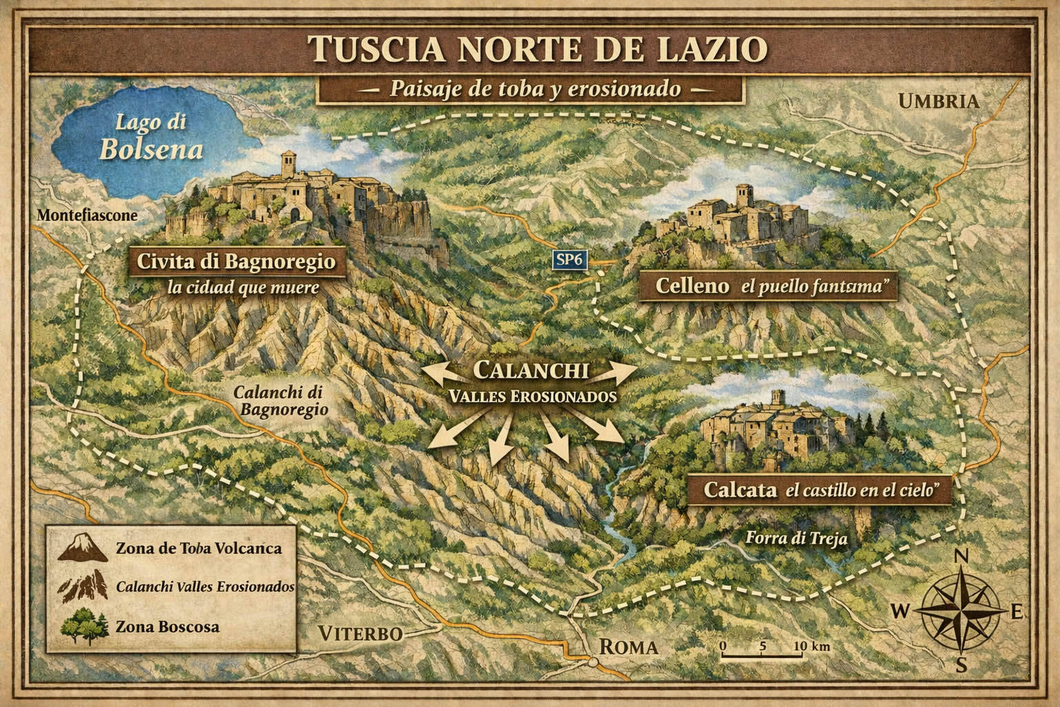 Pero en la región de la Tuscia, en el norte del Lacio, hay varias ciudades similares. La geología del territorio es peculiar: sobre capas de sedimentos marinos arcillosos se asentaron formaciones volcánicas, sobre todo rocas de toba. La toba es extremadamente vulnerable a la erosión. El agua se filtra por sus grietas y excava cavidades que, con el tiempo, se derrumban. Debido a la inestabilidad del subsuelo, se abren fisuras en el borde del acantilado, que empieza a desprenderse en capas verticales. Lo que en un principio parecía una idea brillante —instalarse en la cima de una roca de toba que ofrecía una excelente defensa natural— acaba conduciendo, poco a poco, a la desintegración de la ciudad.