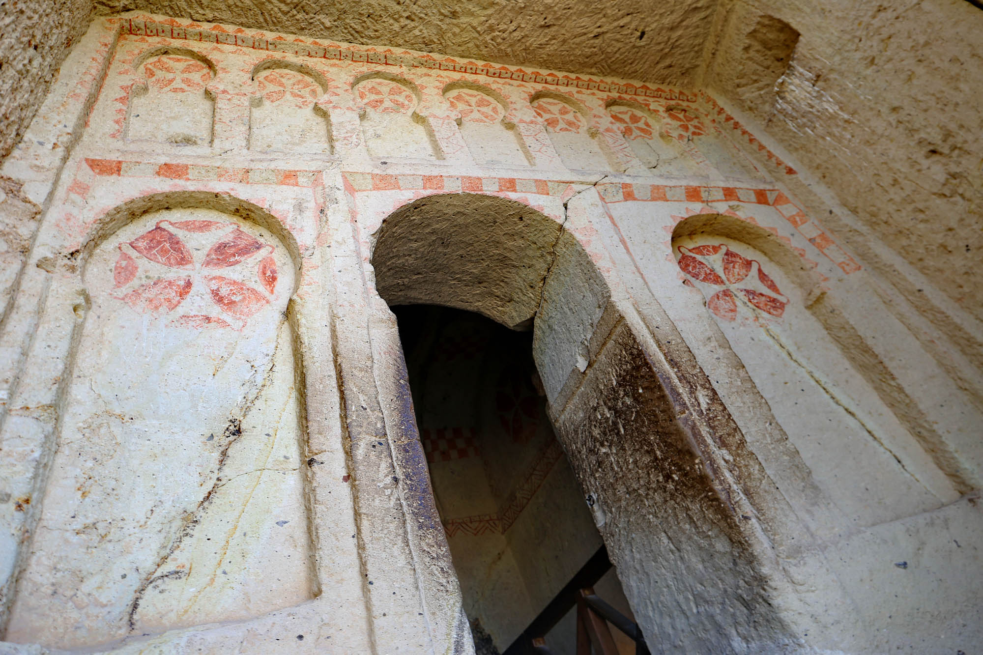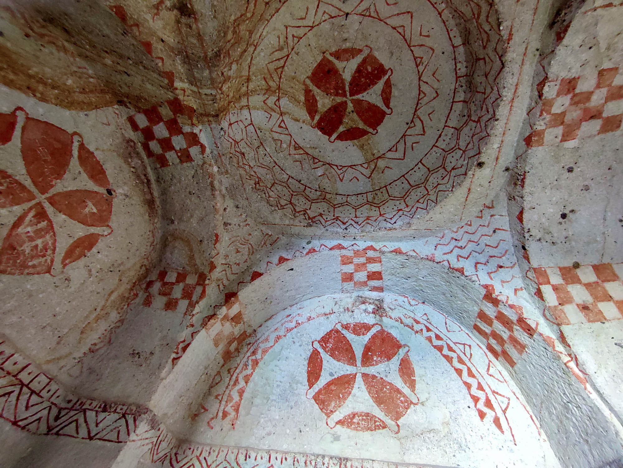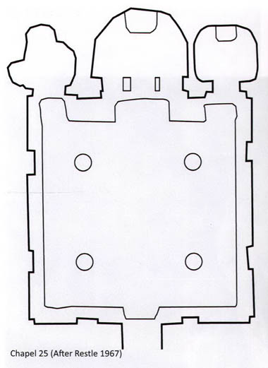 Quizá algo similar se planeó aquí en la capilla n.º 25, pero probablemente nunca se llevó a cabo: las paredes carecen de yeso, no solo de la capa para pintar sino también del preparado rugoso de base. Solo en la viga de la pantalla del santuario se ve una decoración lineal roja similar a la del vestíbulo. Esto sugiere que, al igual que las iglesias de Basilio, Barbara, Serpiente y Pantocrátor, la capilla era decorada durante la segunda época de la pintura en Capadocia, la era de la iconoclasia (siglos VII–IX). Pero, a diferencia de las otras, nunca recibió frescos: tal vez nunca se completó, o quizá no apareció un mecenas dispuesto a financiar un ciclo tan ambicioso, a diferencia de las tres otras iglesias de estructura igualmente rica.