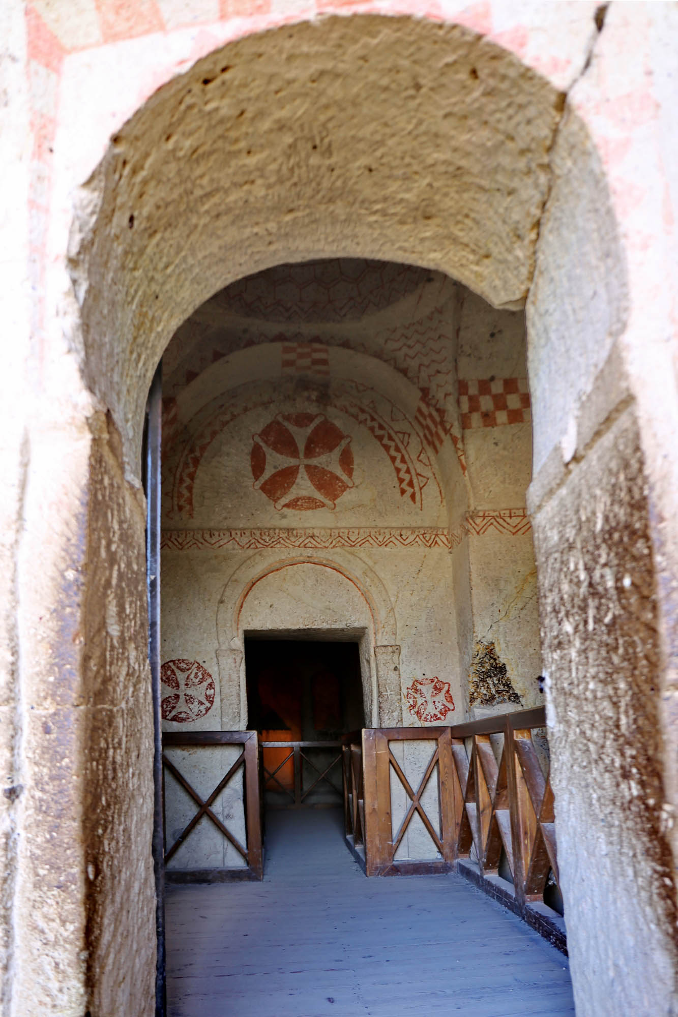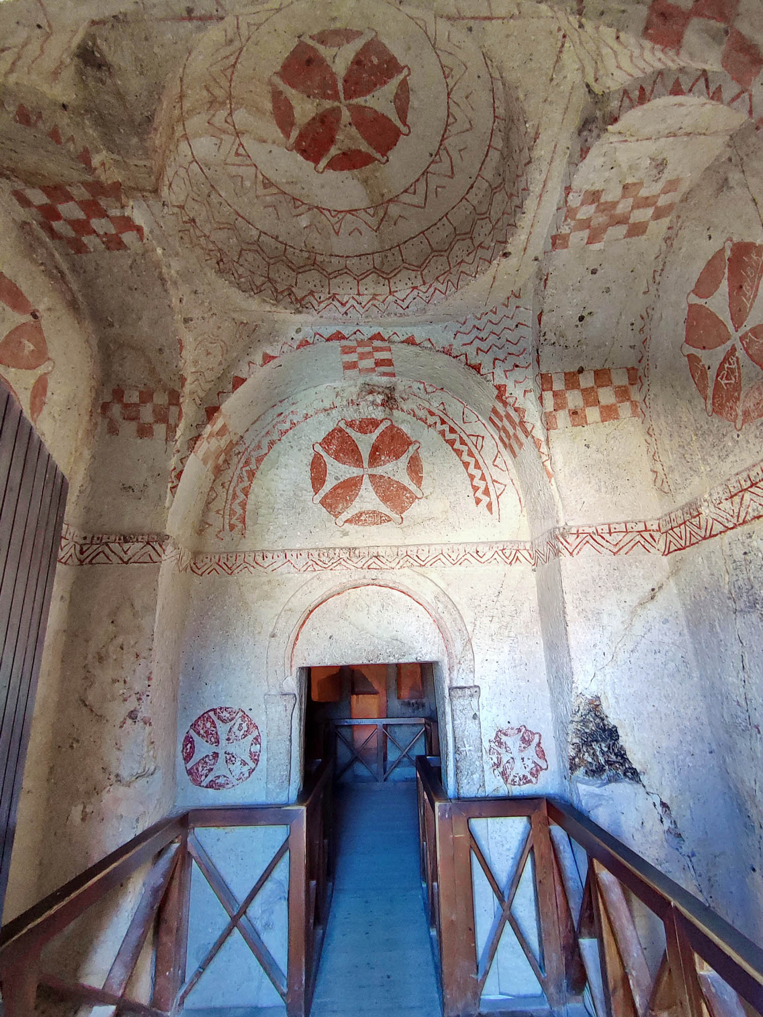 La puerta conduce a un vestíbulo cuadrado cubierto por una cúpula, donde tanto la cúpula como las cuatro lunetas laterales muestran cruces rojas enmarcadas en un círculo. La cúpula está rodeada por ricas decoraciones lineales rojas.