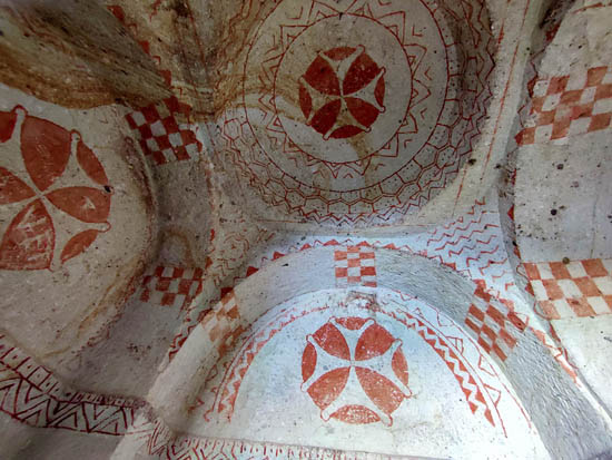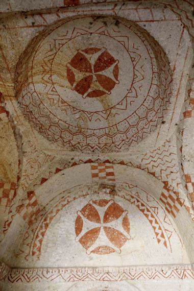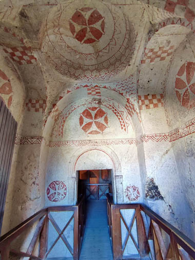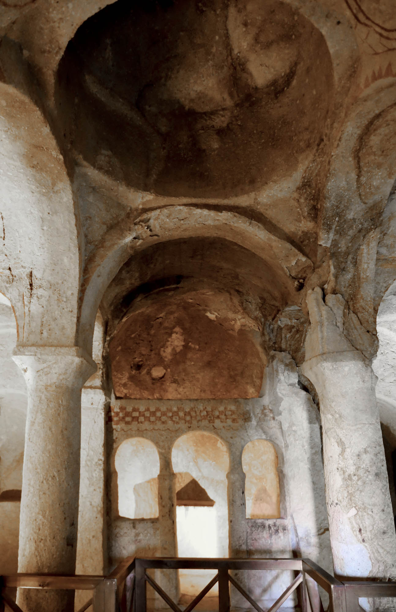 Avanzando, llegamos al santuario, sostenido por cuatro columnas independientes que sostienen la cúpula. Este tipo de «cuatro columnas» es de los más ricos en Capadocia. Otros ejemplos incluyen las tres últimas iglesias de Göreme, decoradas con gran esplendor: Elmalı, Karanlık y Çarıklı, así como la cercana iglesia de San Juan en Çavuşin.
