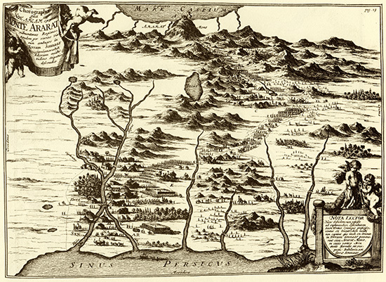Athanasius Kircher, Turris Babel, sive Archontologia... Amstelodami, ex Officina Janssonio-Waesbergiana, Anno MDCLXXIX, p. 22. Corografía de la bajada de Noé y sus descendientes desde las montañas de Ararat, donde quedó depositada el Arca, hasta las llanuras de Senaar, junto a la desembocadura de los ríos Tigris y Éufrates (clic para ver los detalles)