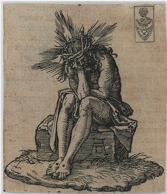 Y miremos ahora los pies del Cristo de Durero. En efecto, la imagen de Durero no es exactamente la misma del Ecce homo descrito por Hojeda, sino la del «Varón de dolores» u «Hombre de aflicción»: una iconografía que no proviene de los Evangelios, sino de Isaías 53, pero que acabó mezclándose con la figura del Ecce Homo. El resultado de esta superposición es poco coherente con el mensaje soteriológico de la resurrección, pues el ataque de melancolía que parece aquejar a este Cristo resucitado no lo integra bien la ortodoxia cristiana. Esta permanencia del dolor, ahora visiblemente manso, casi apacible, un dolor póstumo, ya sin voluntad ni esperanza alguna de que vaya a remitir, hunde al hombre en un nihilismo peor que la muerte. Estos pies atropellados y algo deformes por el tormento recibido centran, de hecho, el núcleo de la composición de Durero. El Cristo resucitado, cuyo estado glorioso se subraya por el nimbo resplandeciente, vuelve a ser por momentos pesadamente terrestre, sentado sobre un sillar macizo y observando sus pies heridos y deformes sobre la tierra, sobre el polvo donde quedará el hombre cuando él suba definitivamente a los Cielos.
