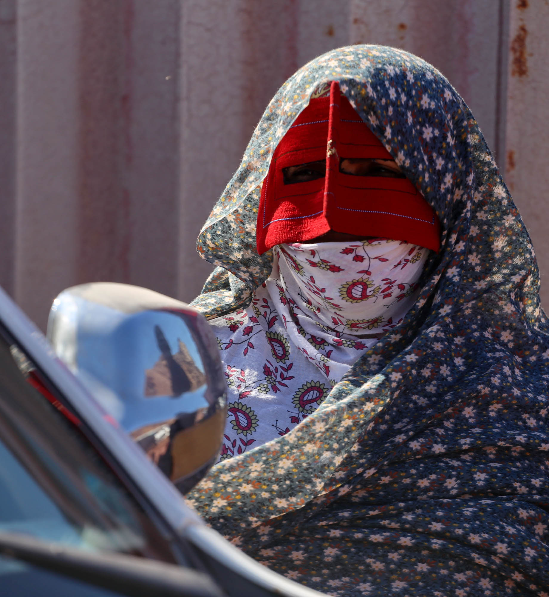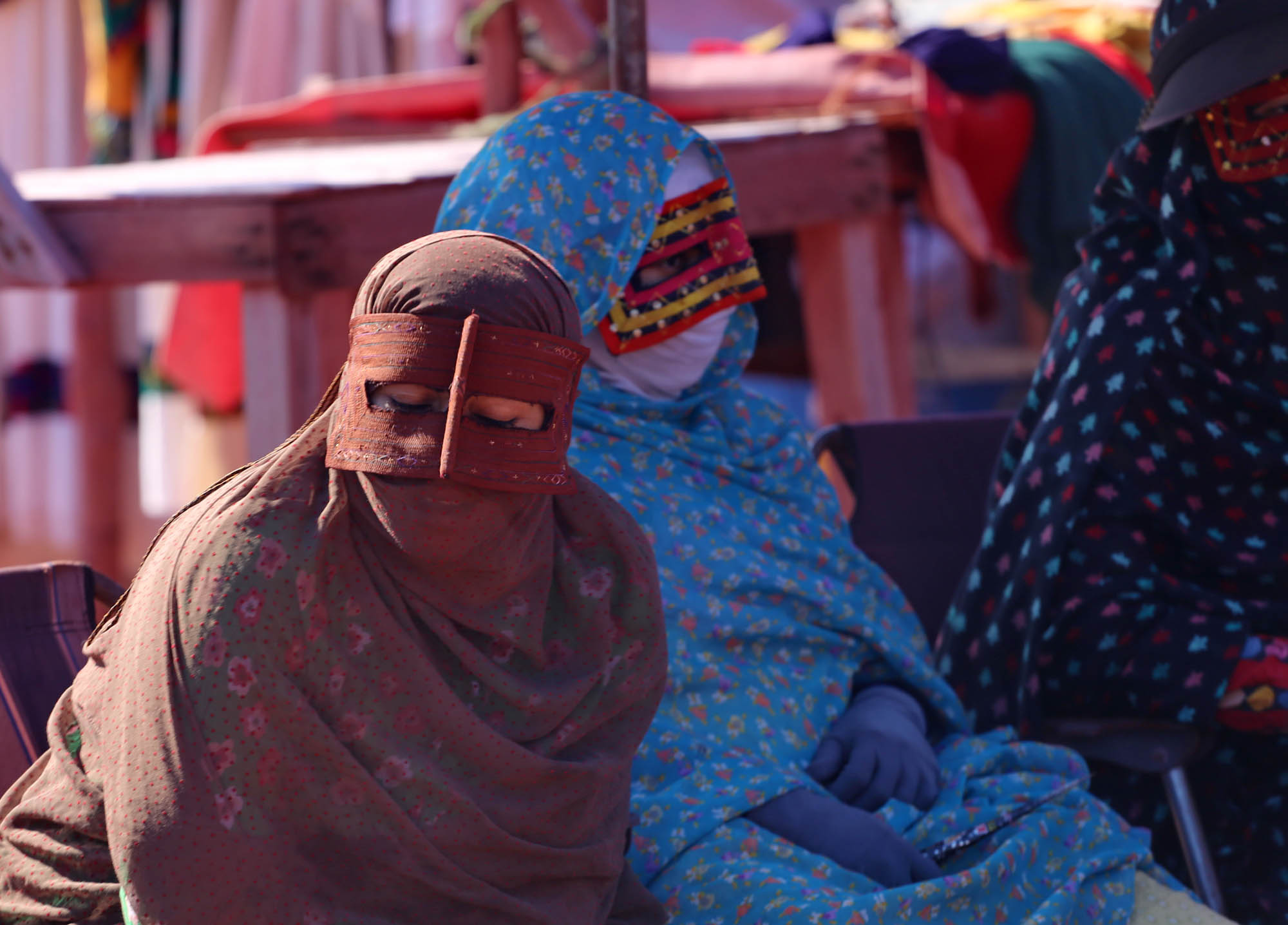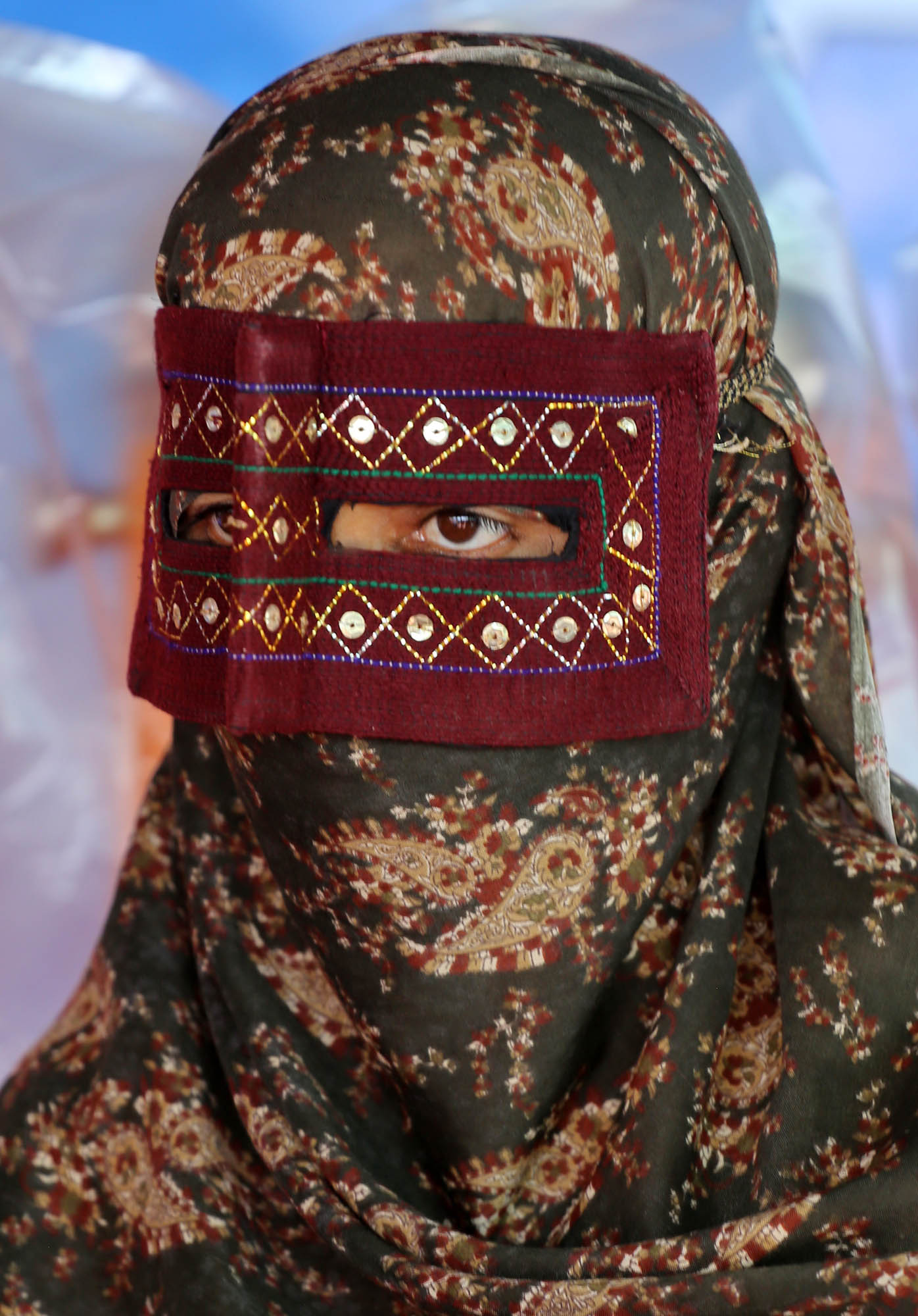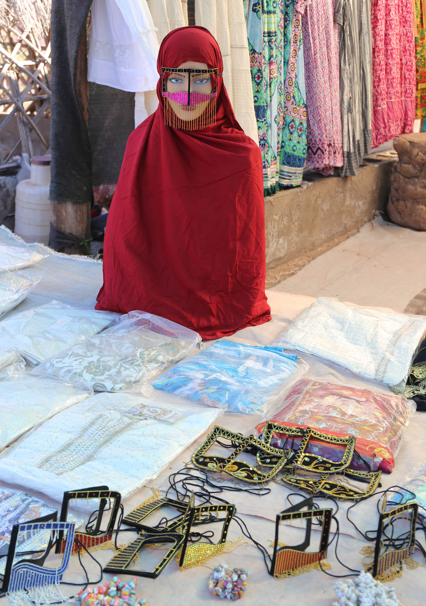 Boregheh یک نقاب زنانه است که به طور خاص در اطراف خلیج فارس پوشیده میشود. انواع مختلفی دارد: بعضی بخش بالایی صورت را میپوشانند و فقط یک شکاف باریک برای چشمها دارند؛ بعضی دیگر روی دهان را به شکل سبیل ضخیم خم میکنند؛ و بعضی به شکل نقاب سفت پارچهای شبیه منقار روی صورت قرار میگیرند. تقریباً همیشه با بورکای تمامقد پوشیده میشود، که پایان منطقی این پوشش است. من این نقابها را از فروشندگان محلی زنان در ساحل سرخ هرمز عکاسی کردم.