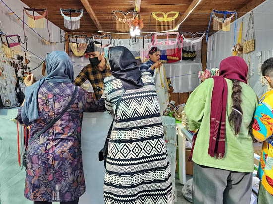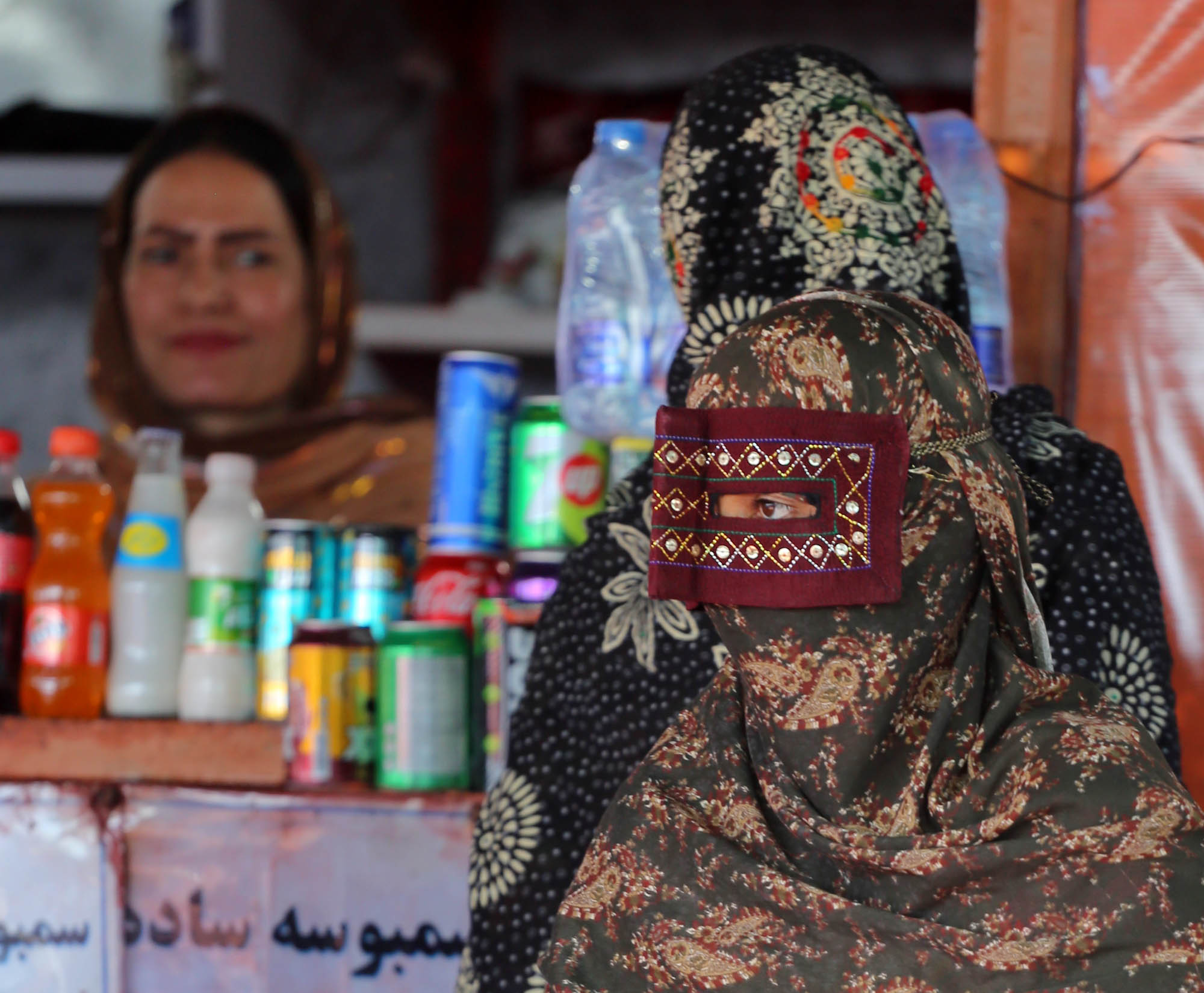 فروشنده boregheh برای گردشگران، با دختران ایرانی که در حال تماشای محصولات در غرفه هستند