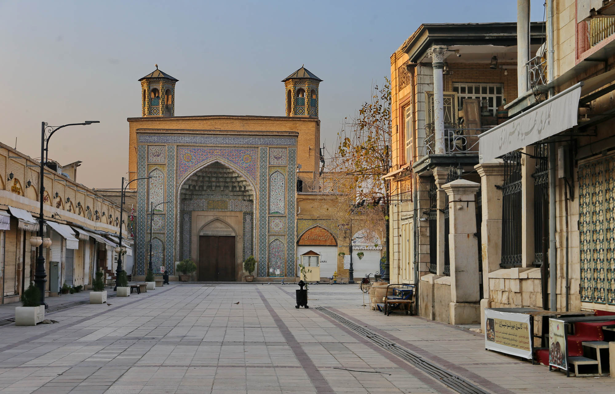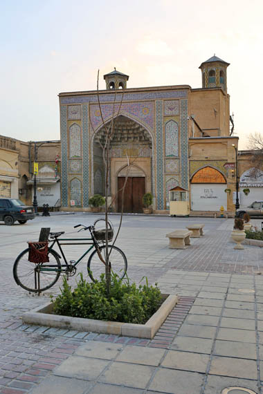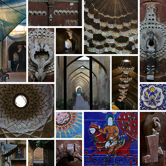 Derrière la mosquée Vakil s’étend un corridor voûté qui laisse percevoir l’atmosphère historique que l’on ressentirait dans le bazar, la mosquée ou le vieux hammam si l’on pouvait y entrer. Depuis ce corridor, des madrasas, des cours de mosquée, des caravansérails et des cafés s’ouvrent sur des arches avec des voûtes stalactites carrelées, d’anciennes portes avec des clous en fer, toutes désormais bien fermées. La vieille ville de Chiraz regorge de ces petits trésors ; il suffit de flâner dans les ruelles sinueuses, de guetter des indices de ce qui se cache derrière chaque porte, et d’espérer avoir la chance de trouver une porte ouverte où l’on sera accueilli.