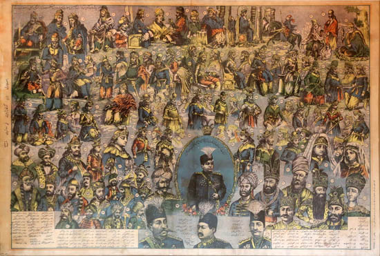 La chance est de notre côté. Dans les rues au-delà du caravansérail Moshir, où plusieurs anciennes maisons marchandes avec cour ont été transformées en maisons d’hôtes, l’une d’elles – la maison Foroughi – a sa porte entrouverte. Nous jetons un coup d’œil à l’intérieur. Une belle cour avec bassin, orangers, portes et encadrements de fenêtres en bois de l’époque Qajar incrustés de verre coloré. Nous entrons même dans la salle à manger de l’époque Qajar, dont les murs sont couverts de carreaux miroir du sol au plafond à poutres peintes. Dans le couloir, une gravure de l’ère du Petit Prince Ahmad Shah (1909-1925), représentant le jeune souverain comme héritier des grands rois perses, de Cyrus à Nasreddin Shah. Les anciens propriétaires de la maison étaient clairement des partisans de la dynastie Qajar, exilée par l’ancien Reza Pahlavi – tout comme lui-même par les Britanniques, puis son fils par la révolution civile islamiste. Mais la gravure a survécu à tous ces changements de régime et survivra probablement aussi au régime actuel, inshallah.