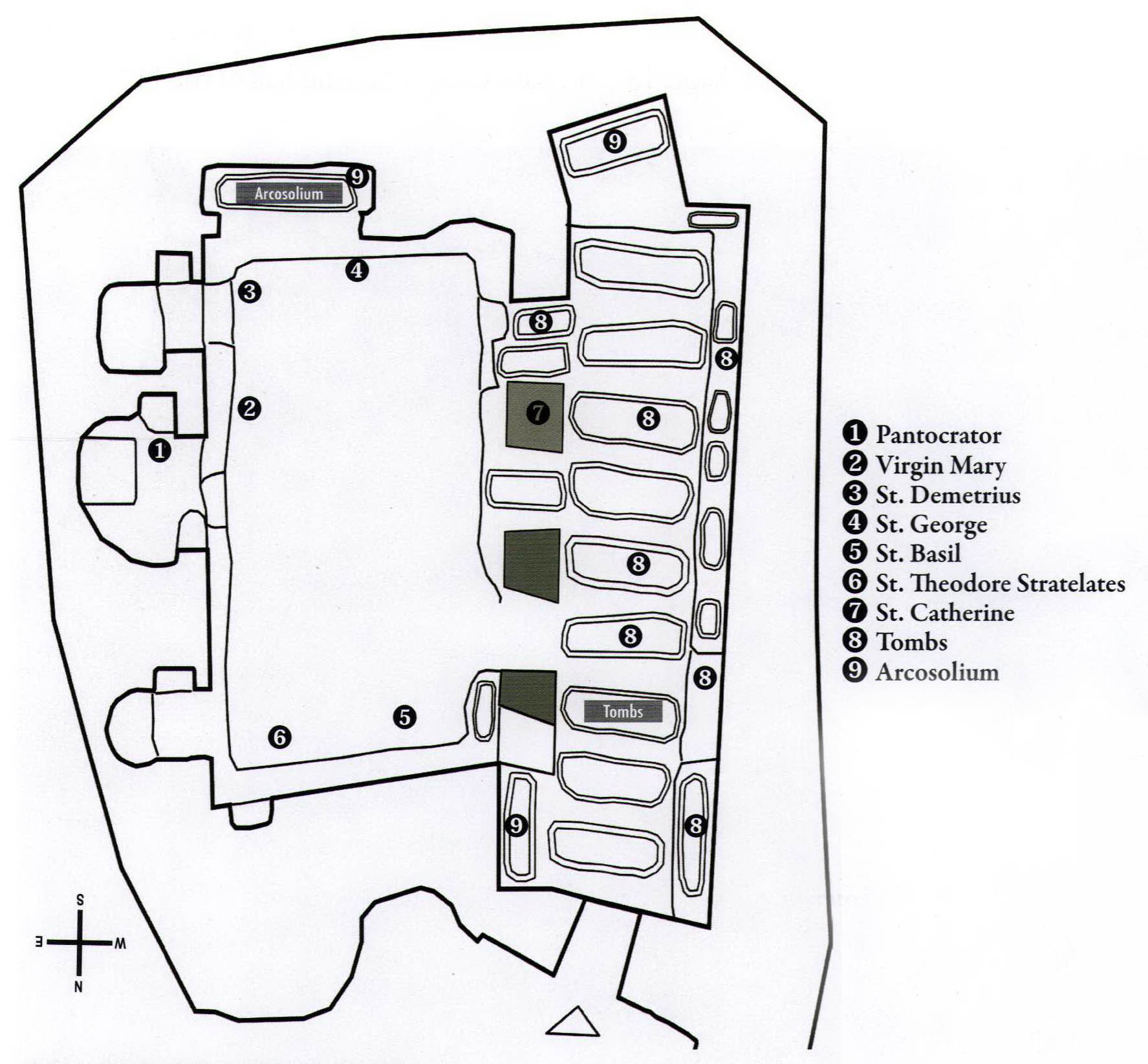 L’église Saint Basile possède deux nefs : dans la nef extérieure se trouvent des tombes, probablement de moines. Cette solution à deux nefs, inconnue en Occident, était courante dans l’architecture orthodoxe primitive, où la nef latérale extérieure servait principalement aux commémorations funéraires et aux rituels laïques, comme dans les églises de Soukhoum en Géorgie aujourd’hui.