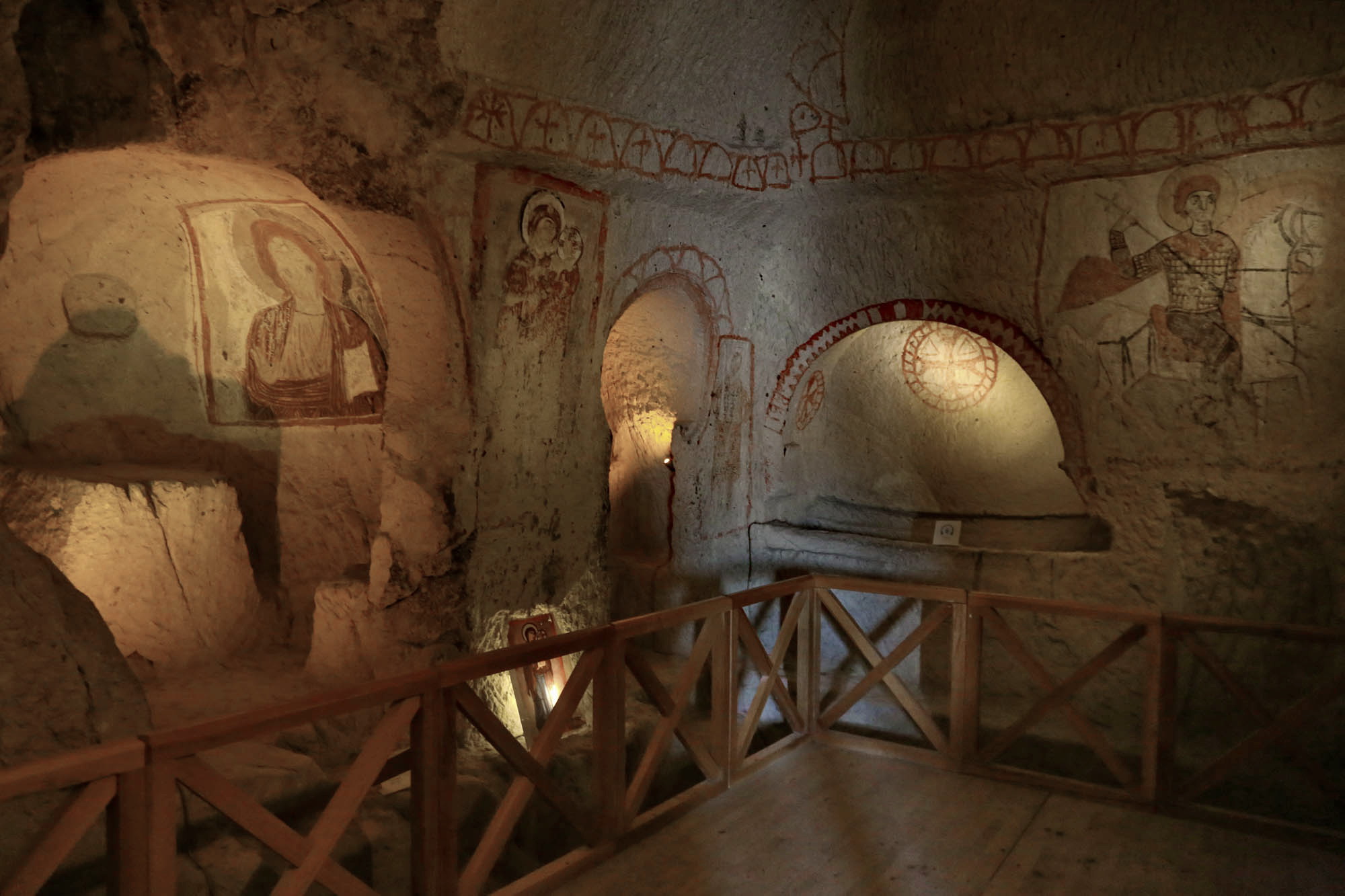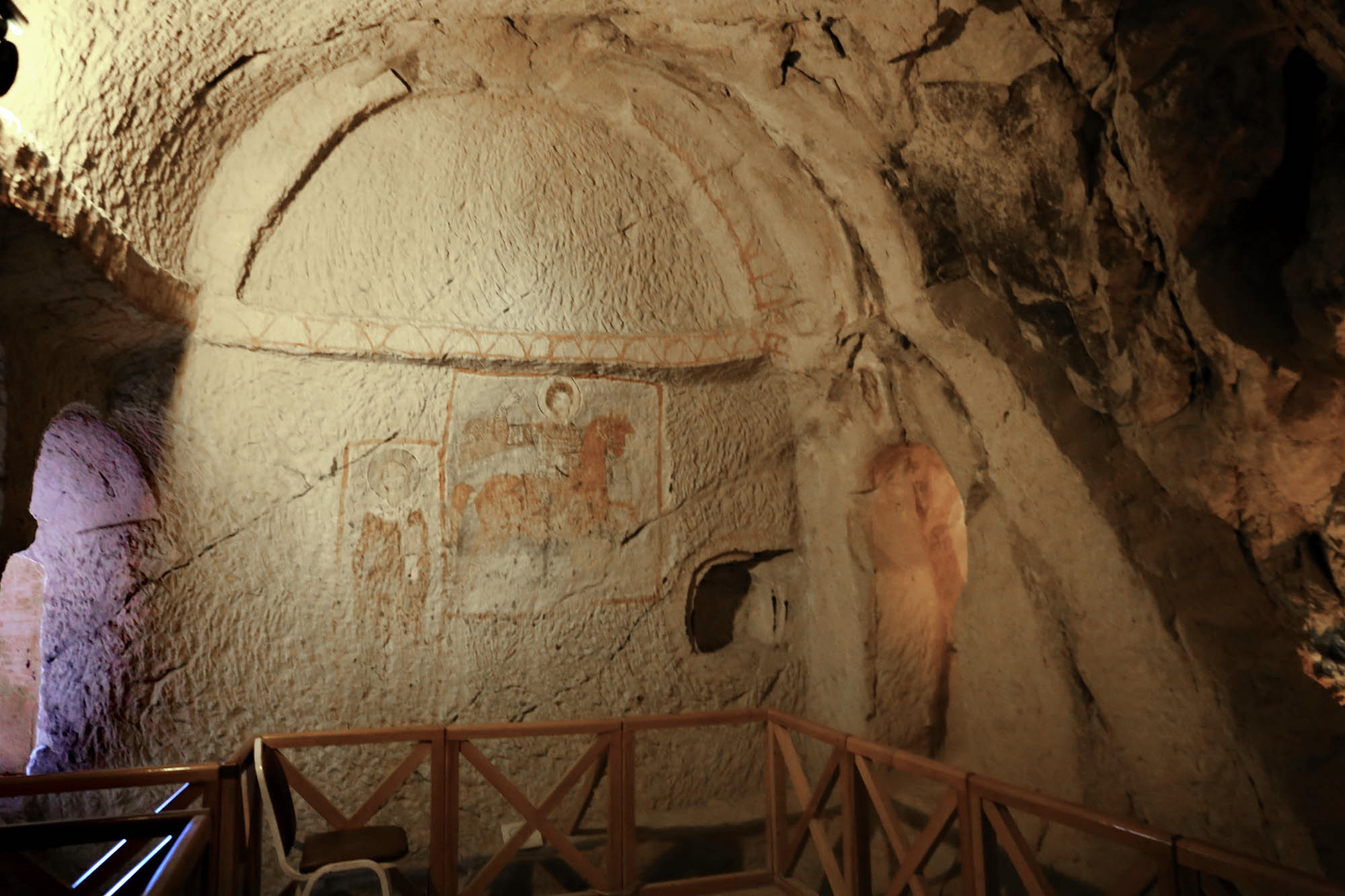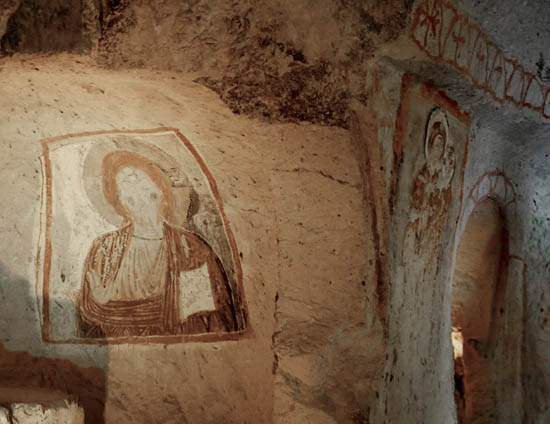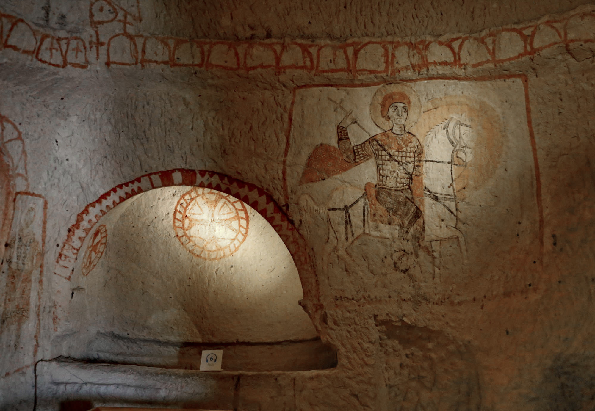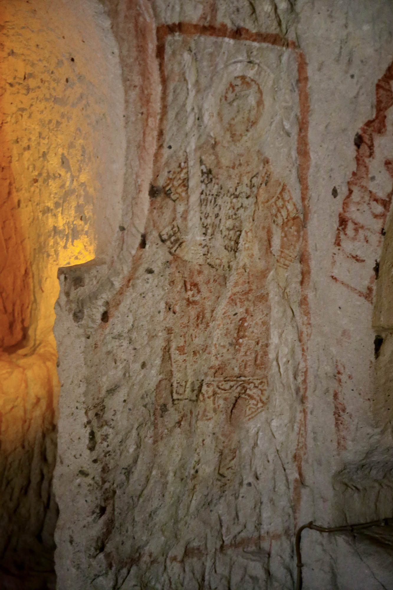 Ainsi, nous ne connaissons même pas les noms originaux des églises. Les noms actuels se basent sur les représentations principales à l’intérieur. La première église du parcours muséal – officiellement « Chapelle n°18 » – est appelée « Église Saint-Basile », car sur le mur nord d’entrée figure l’image de Saint Basile (Basileios), évêque de Césarée, Père de l’Église de Cappadoce et fondateur du monachisme orthodoxe.