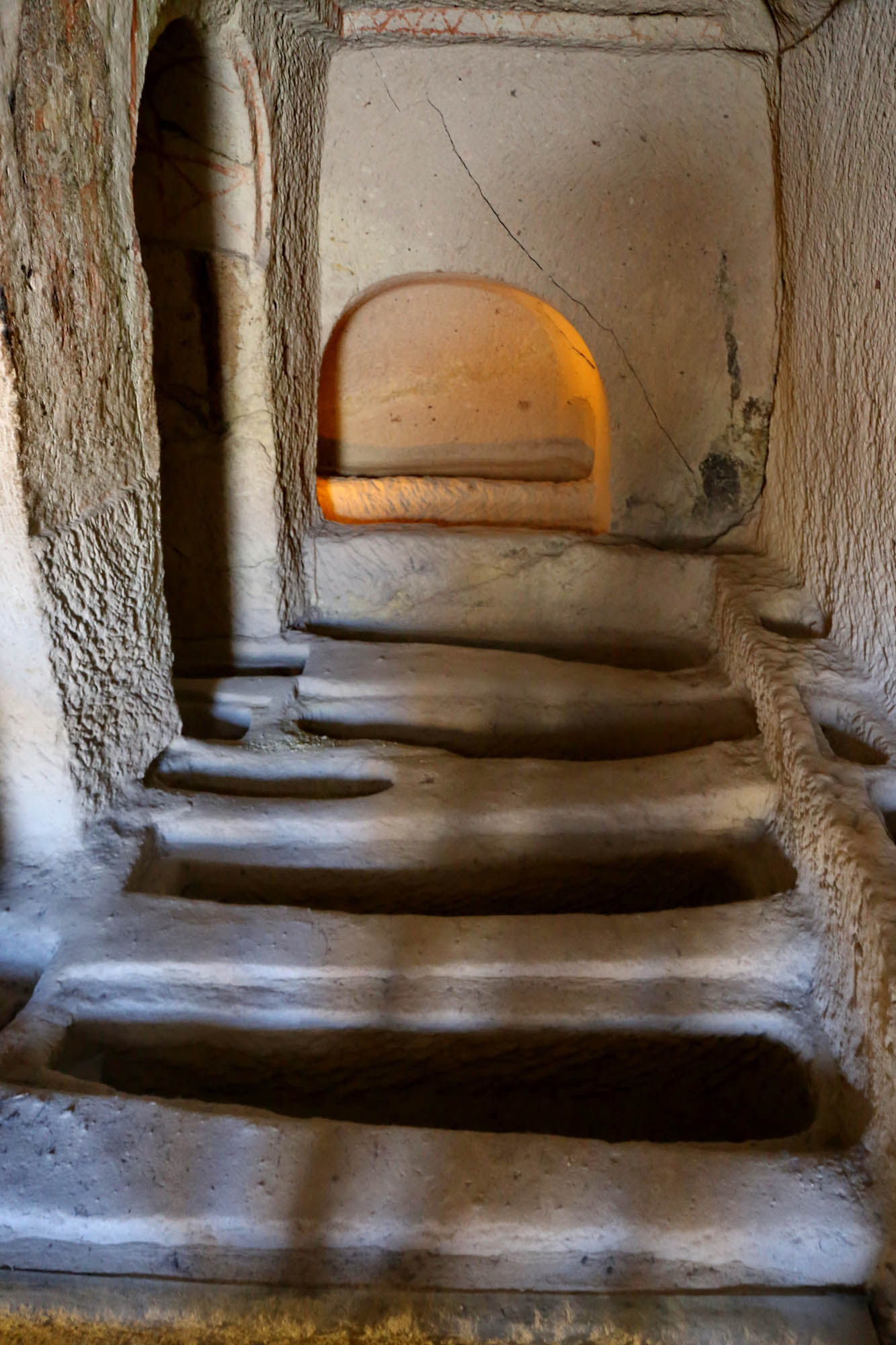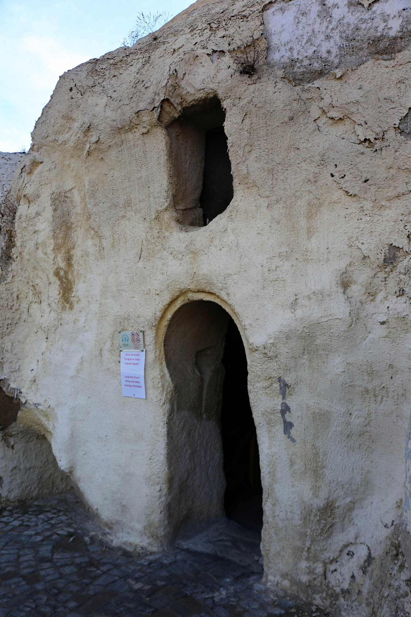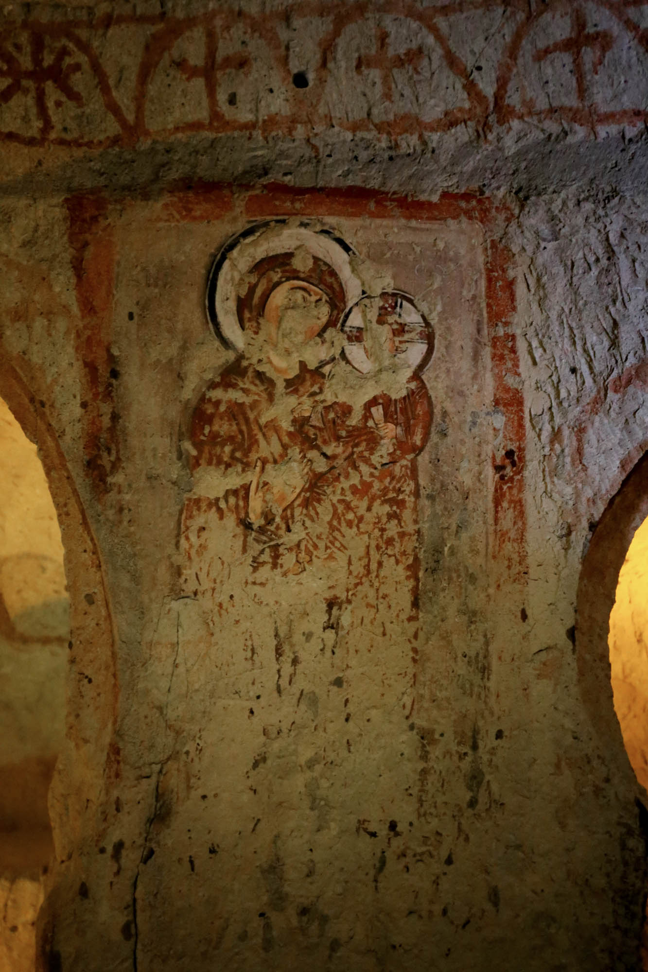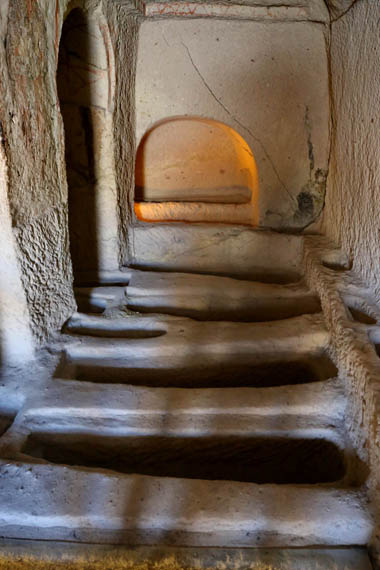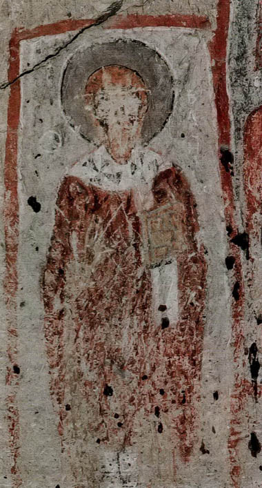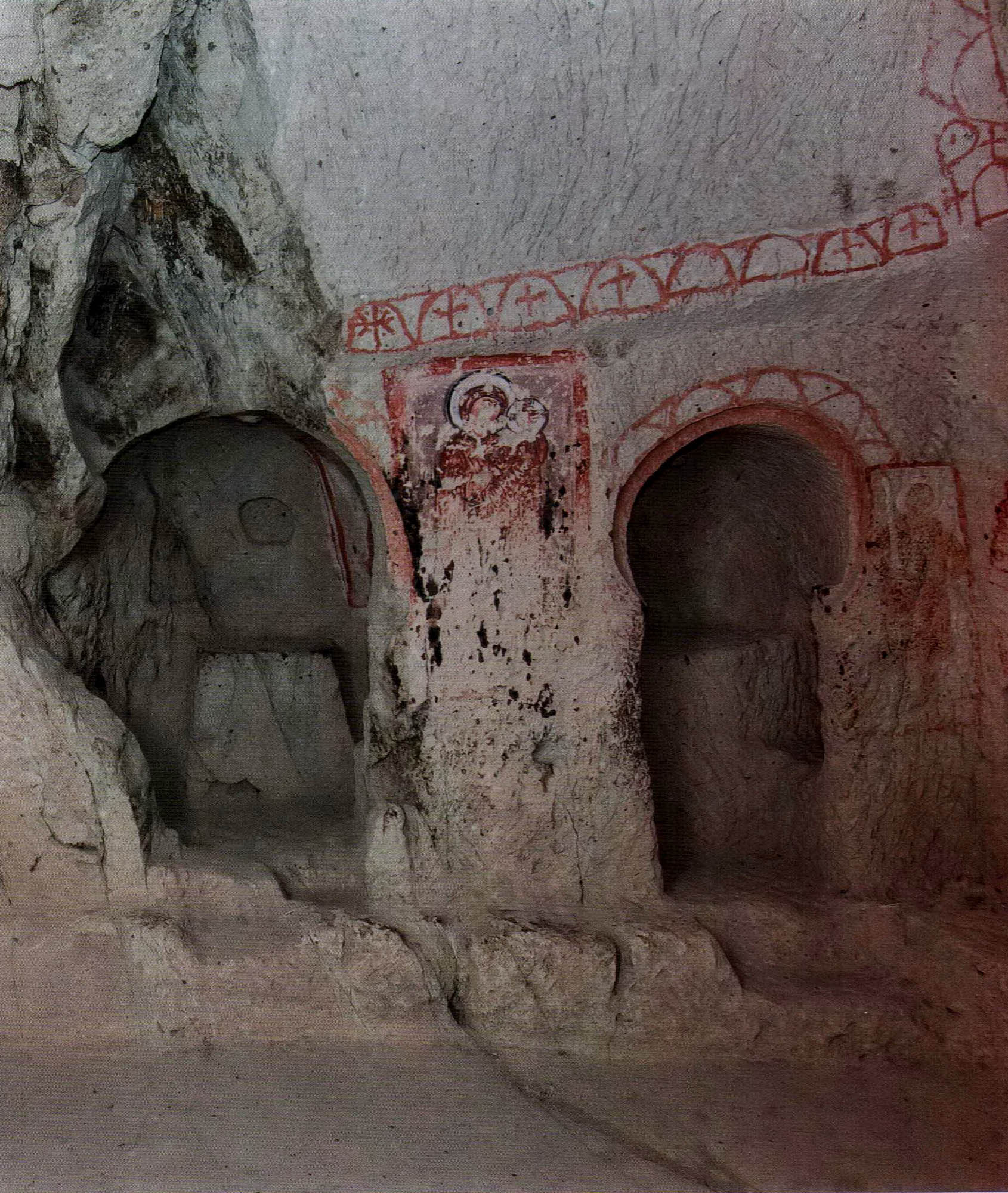Ainsi, nous ne connaissons même pas les noms originaux des églises. Les noms actuels se basent sur les représentations principales à l’intérieur. La première église du parcours muséal – officiellement « Chapelle n°18 » – est appelée « Église Saint-Basile », car sur le mur nord d’entrée figure l’image de Saint Basile (Basileios), évêque de Césarée, Père de l’Église de Cappadoce et fondateur du monachisme orthodoxe.