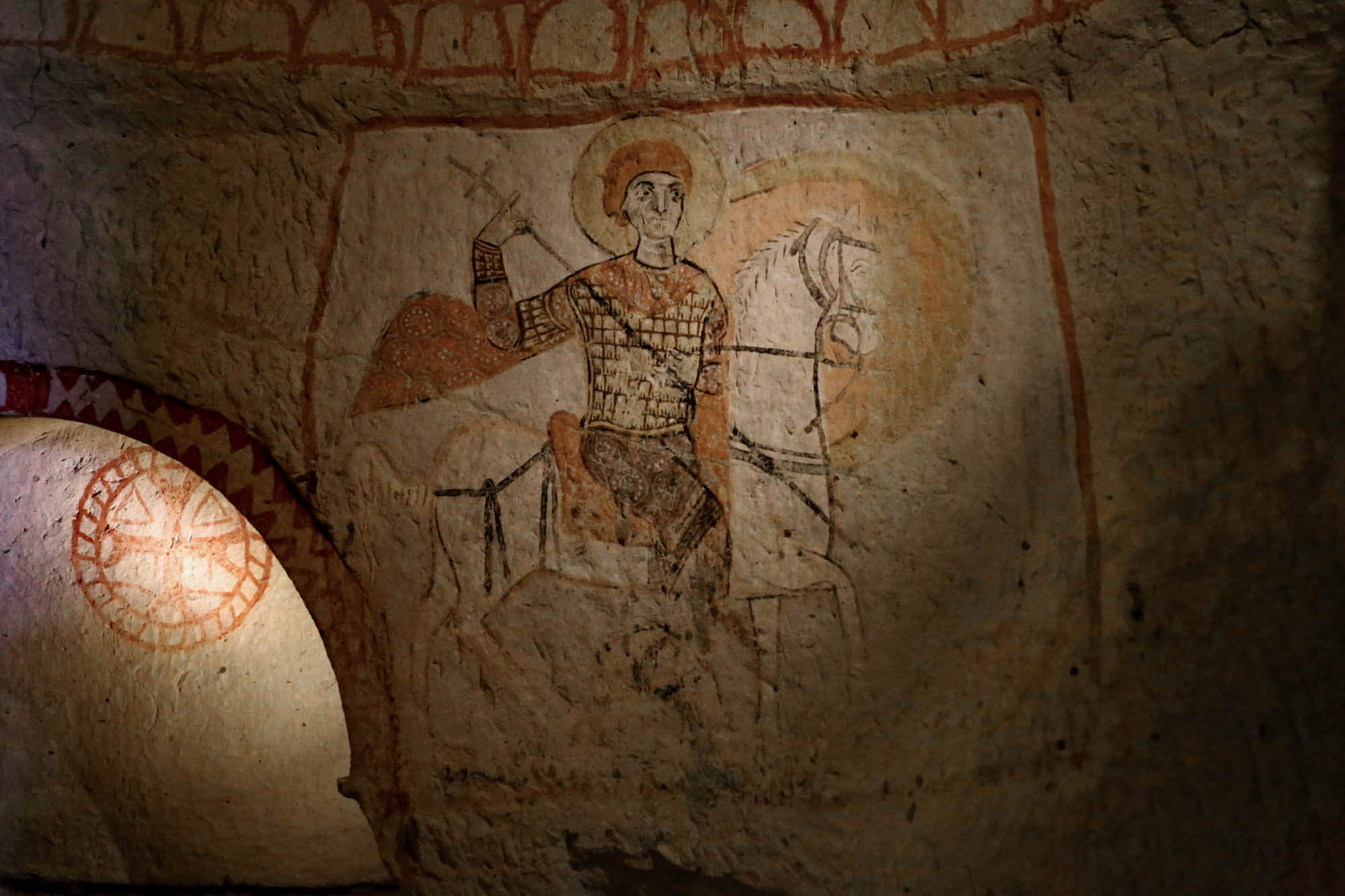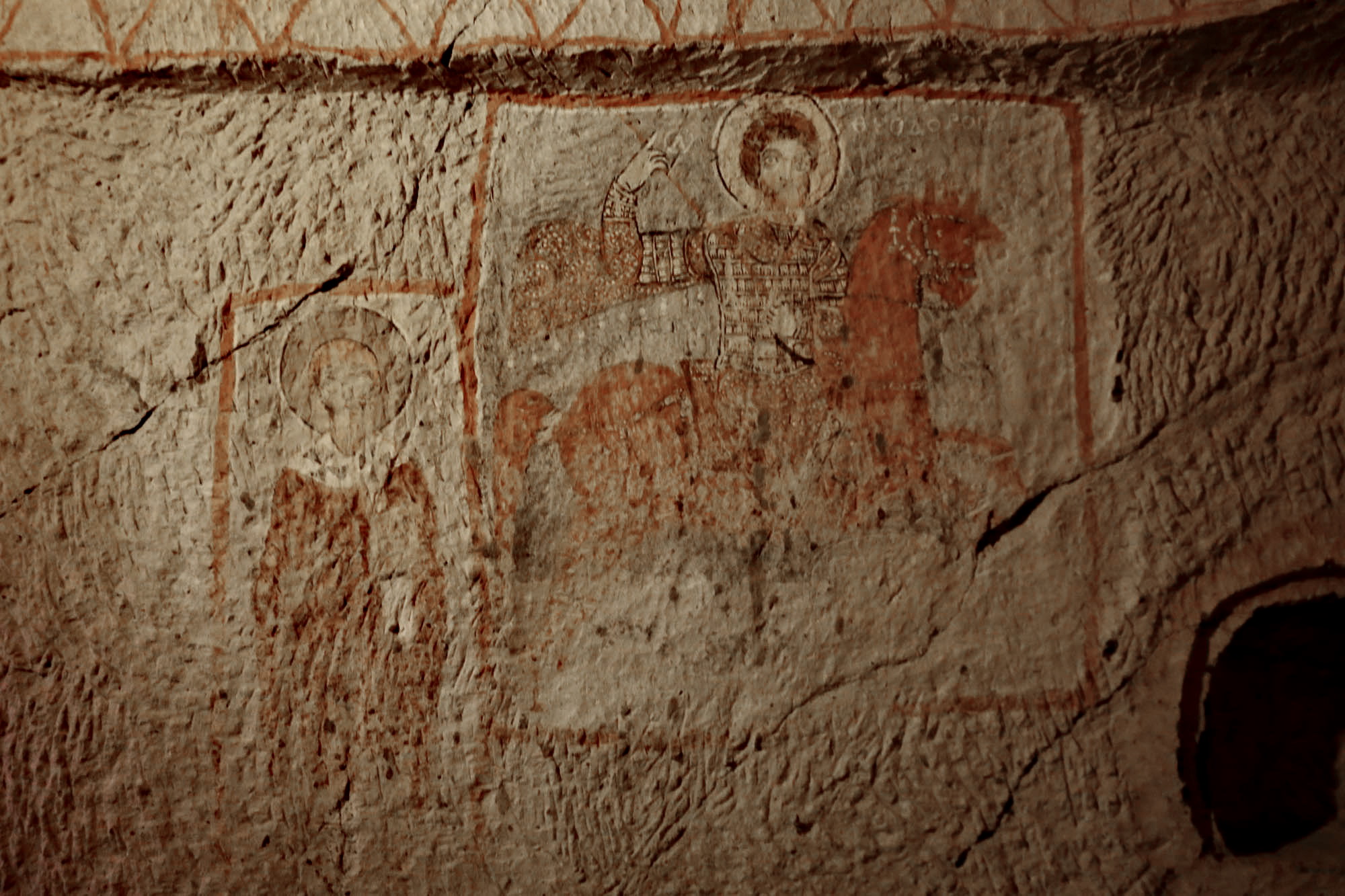 Les saints guerriers, en particulier les cavaliers Saint Théodore et Saint Georges, étaient des figures importantes de l’art cappadocien. La région, frontalière, comptait de nombreux soldats byzantins et une population locale régulièrement impliquée militairement, ce qui explique l’importance des saints guerriers. Théodore et Georges apparaissent souvent ensemble, se faisant face, comme dans d’autres églises de Göreme. J’ai déjà écrit à propos de Saint Georges : son culte s’est renforcé au Xe siècle en Géorgie ; ici il monte pour la première fois et commence à tuer des dragons, un attribut auparavant réservé à Saint Théodore. Les deux saints cavaliers sont souvent représentés ensemble en Géorgie. La Géorgie et la Cappadoce étaient étroitement liées au Moyen Âge : le christianisme arriva en Géorgie depuis la Cappadoce dès le IVe siècle, et les rois géorgiens fondèrent ou soutinrent plusieurs églises en Cappadoce, ramenant ainsi Saint Georges le tueur de dragons dans la région, où il devint presque un saint national.