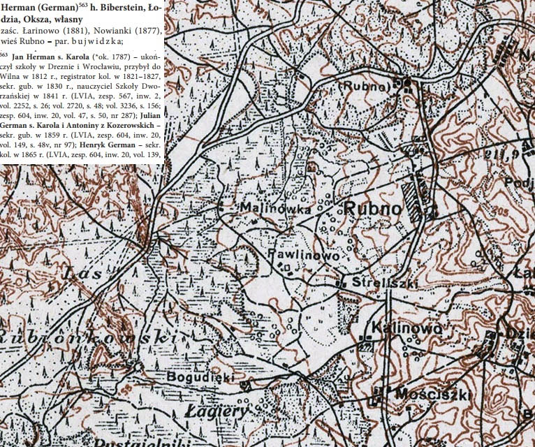 Rubno birtok és falu egy 1933-as lengyel térképen. A „Las Rubionkowski”, a rubnói erdő ma védett madárfészkelőhely a külvárosban, közvetlenül Vilnius lakótelepei mögött. A beillesztett szöveg kivágás Czeslaw Malewskinek a Wilno-környéki nemességről szóló könyvébőlMost, hogy tangó-időgépünk egy egész évszázadot utazott velünk, s az 1930-as évekből 1830-ig jutottunk, már nem kell mélyebbre hatolnunk a múltba. Az eredeti Fekete szemek szerzői, Jevgenyij Grebenka és Nicholas DeVitte mindketten élnek és erejük teljében vannak ebben az időben. S a történészeknek köszönhetően mindkettőjük életét viszonylag jól ismerjük (ami nem jelenti azt, hogy a Fekete szemek története kevésbé bővelkedne rejtélyekben és valószínűtlen fordulatokban).