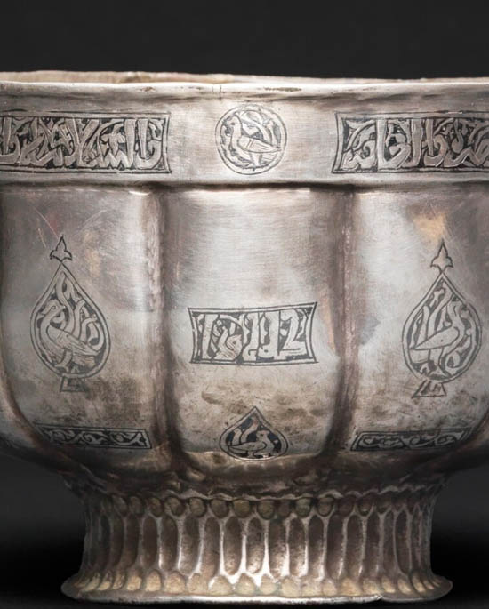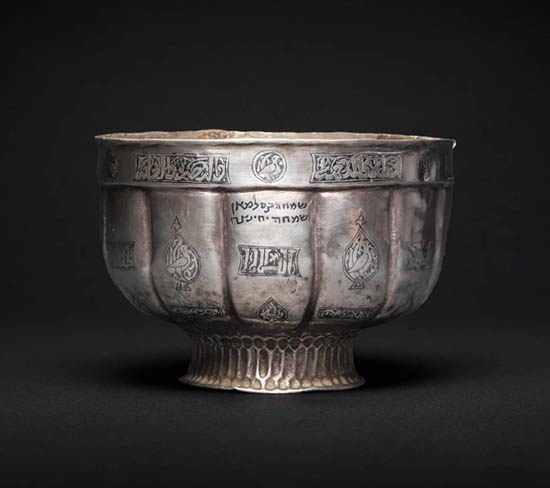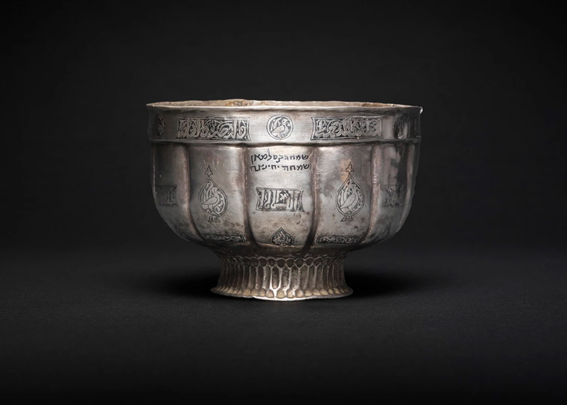 Ilyen helyi mesterek készíthették ezt az ezüst kiddus-poharat is, amelynek motívumai – a szőlőlevelekbe ágyazott arab feliratok és azok kalligráfiája, a csepp formájú motívumok a madarakkal – egyaránt a hely és a kor jellemzői, mint ahogy az is, hogy a feliratok két nyelven készültek: héberül és arabul.