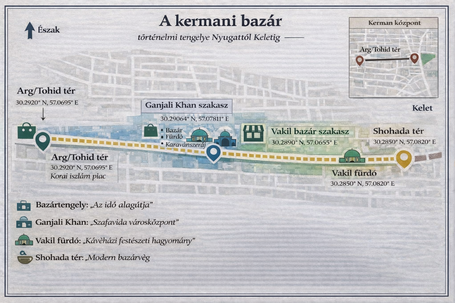 A kermani bazár MI-vel generáltatott vázlata. A bazár egy hosszú folyosó; nyugaton van a díszes bejárata, kékkel jelölt első szakasza Ganjali Khân (1596-1621) korában épült, zölddel jelölt második szakasza pedig Vakil-ol-Molk, a Királyi Helytartó, Ishmail Khân Nûri korában, 1860 körül