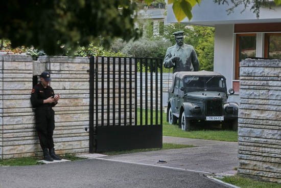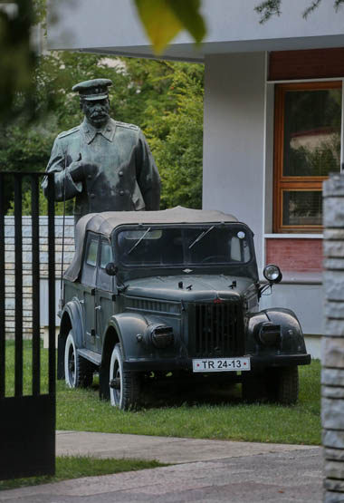 Anche senza avvicinarsi al cancello, dal parco accanto si possono fotografare la villa e le statue. Tra gli alberi si distingue chiaramente la testa di Lenin; subito oltre il cancello svetta Stalin, davanti all’inquietante auto nera della Sigurimi, una UAZ sovietica oggi d’epoca. Chissà se ancora la usano per andare a prendere i vecchi comunisti, per metterli subito “in atmosfera”.