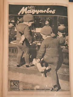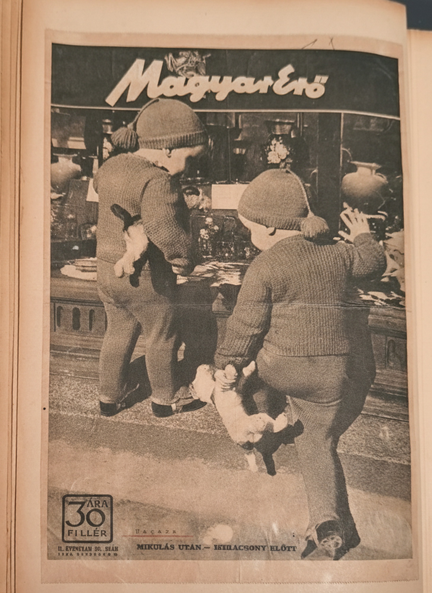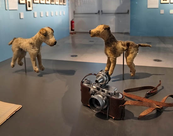 La macchina fotografica di Hanns Tschira e due giocattoli d’epoca in esposizione: molto probabilmente gli stessi due cani che si vedono nelle mani dei suoi figli sulla copertina della rivista ungherese.