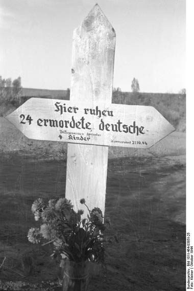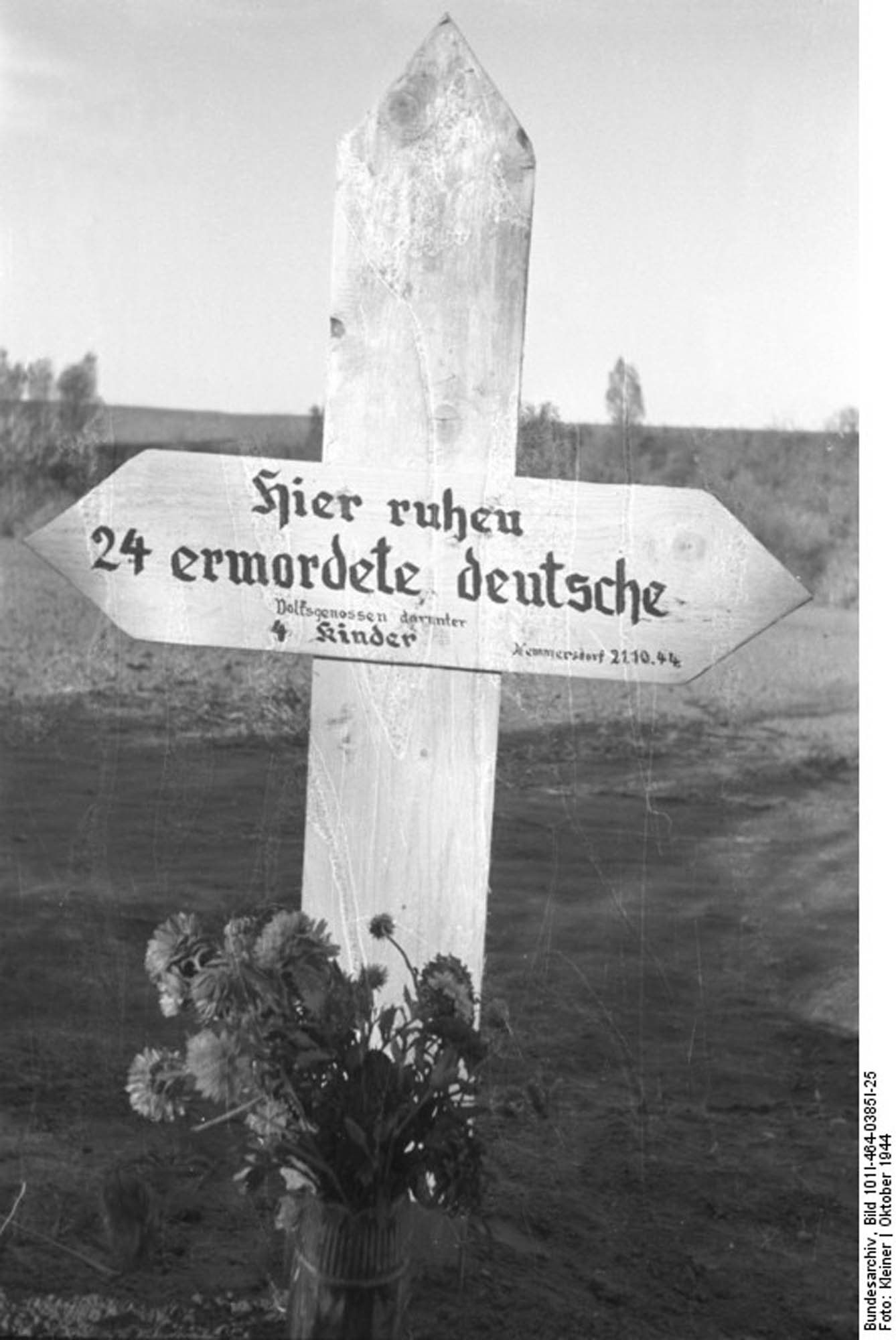 Il memoriale eretto dopo il massacro a Nemmersdorf. Quando l'Armata Rossa tornò, distrusse anche questo monumento, come tutti gli altri memoriali e tombe militari tedesche e non tedesche.