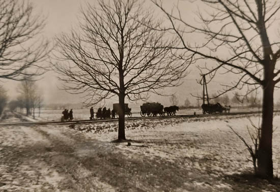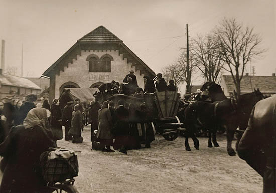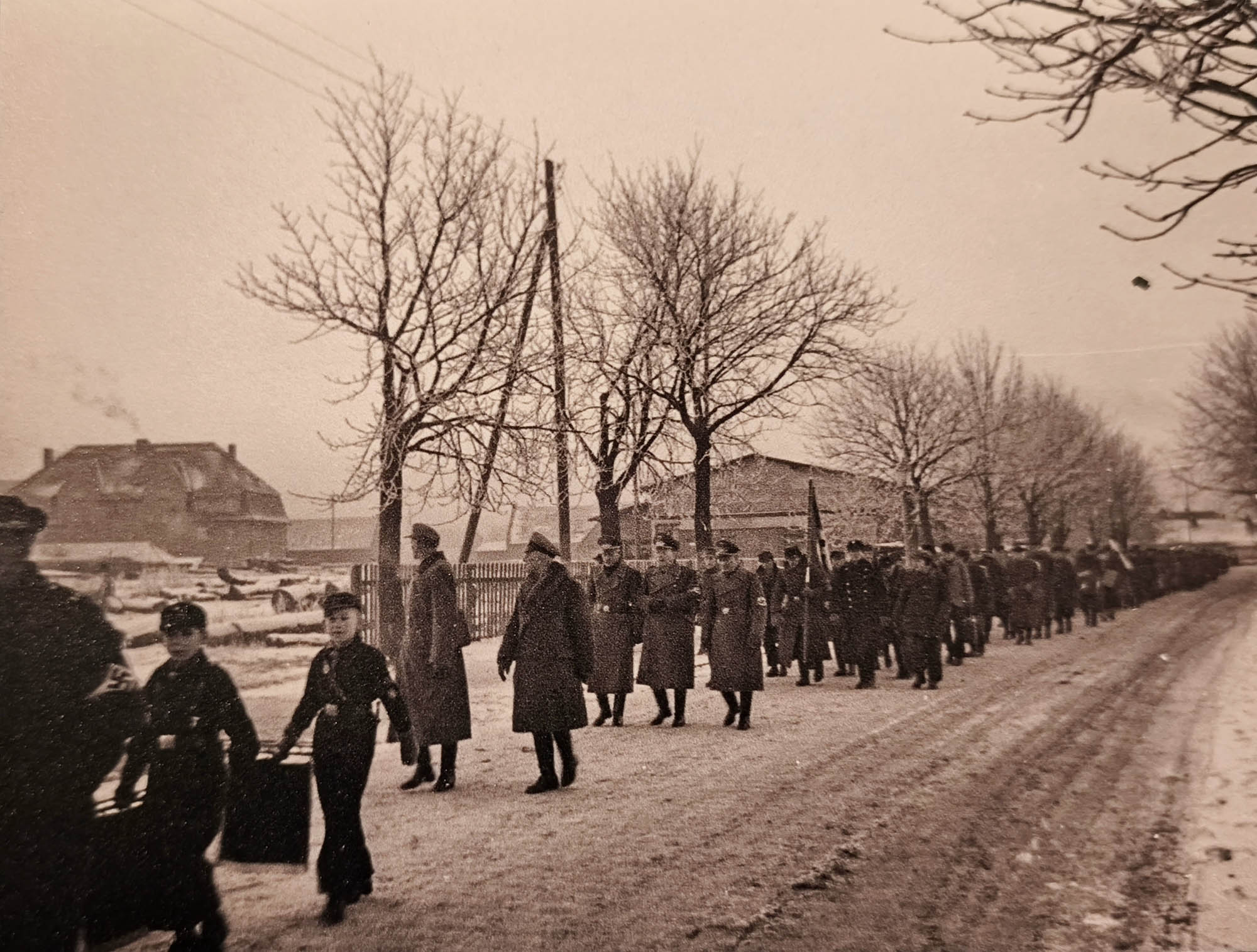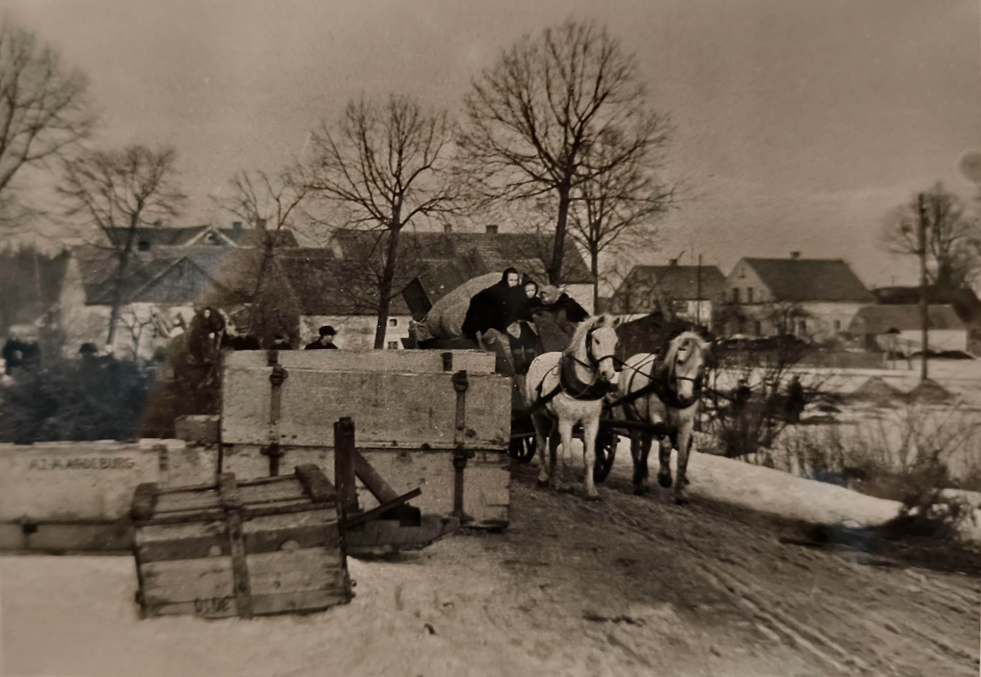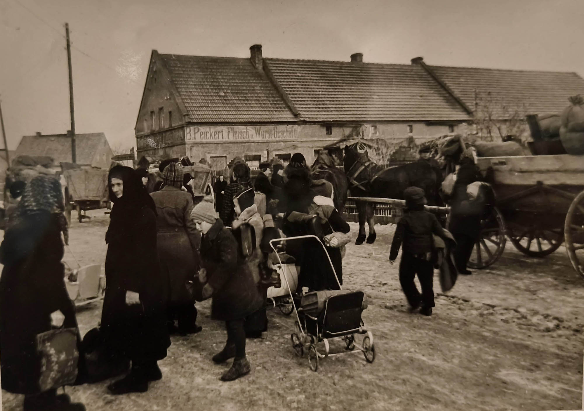 La raccolta avvenne nel centro del villaggio, davanti al negozio di generi alimentari di Fritz Hanke (sopra) e alla macelleria di Bruno Peickert (sotto). Si radunarono in totale 350 persone da Lübchen e dal vicino villaggio di Korangelwitz, inclusi 120 bambini. Era consentito portare solo l’essenziale. Poiché il villaggio si trovava lungo l’Oder e aveva poche strade, il trasporto dipendeva principalmente dalle barche e solo dodici carri potevano essere assemblati. Alcuni cavalli non avevano mai trainato un carro prima. Con l’assenza degli uomini, le donne dovettero sopportare la maggior parte del carico. La temperatura era di -15°C e presto arrivarono le tempeste di neve. Solo dal distretto di Guhrau, in quei giorni, partirono sessanta colonne simili, coinvolgendo circa 25.000 persone.