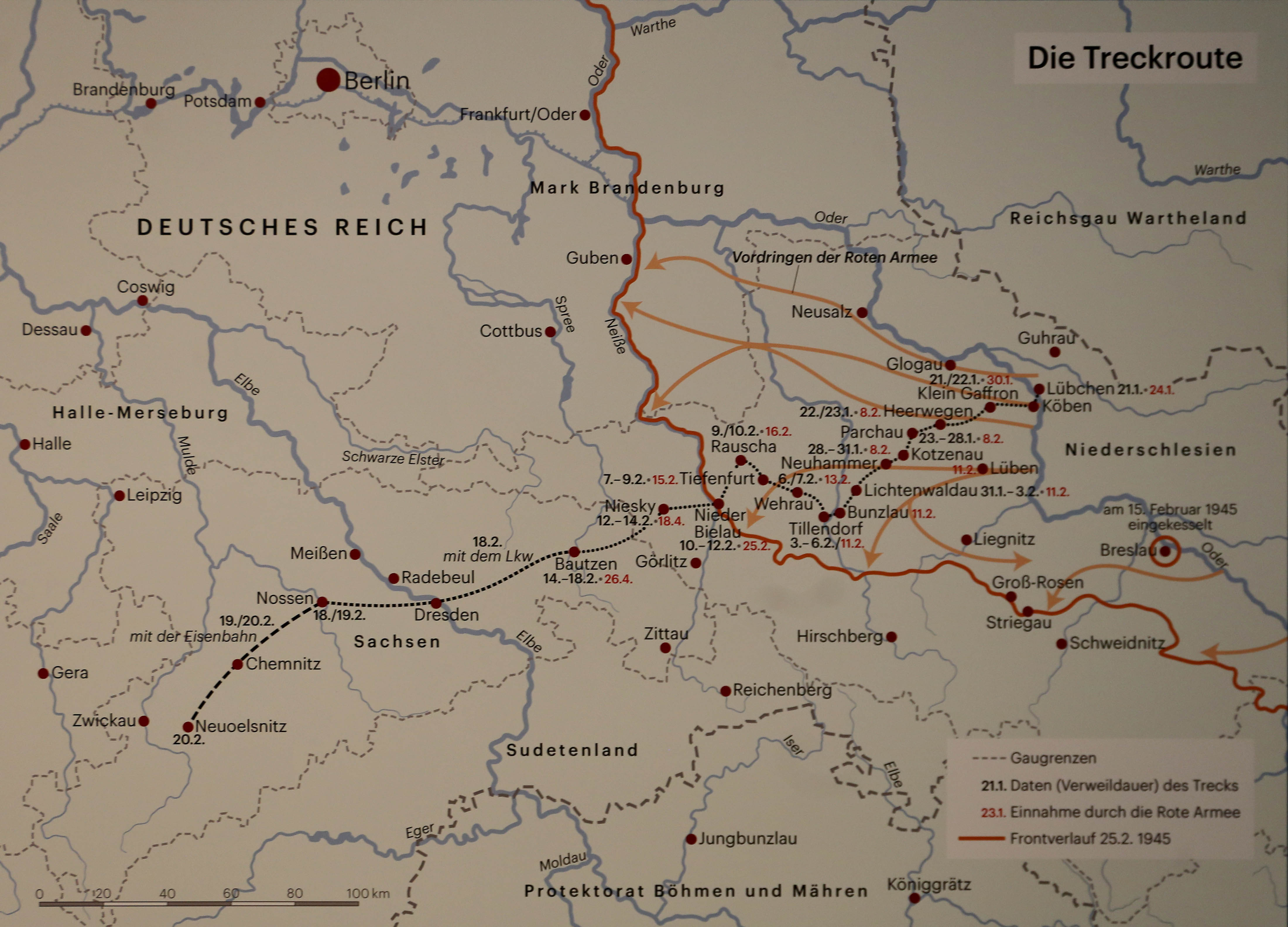 Le autorità naziste, che fino all’ultimo momento insistettero sulla vittoria imminente della Germania, non prestarono alcuna attenzione all’evacuazione della popolazione civile. Ovunque, i villaggi interessati dovettero organizzare la propria evacuazione all’ultimo minuto. A Lübchen, il segretario di partito del distretto ordinò l’evacuazione per telefono la sera del 20 gennaio 1945, quando l’Armata Rossa era già a soli cinquanta chilometri dalla Bassa Slesia. Gli uomini tra i 16 e i 60 anni dovevano presentarsi al “Volkssturm” (milizia popolare); solo donne, bambini e anziani potevano partire.