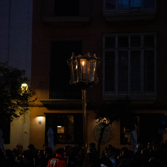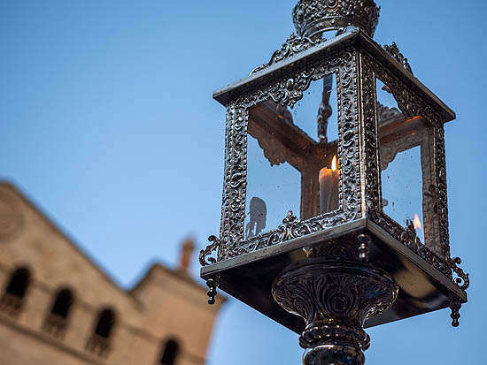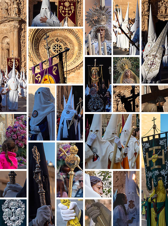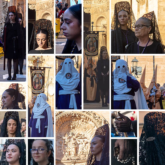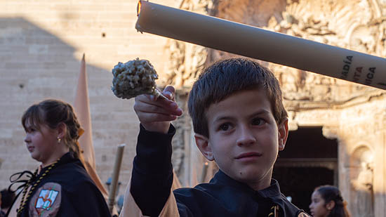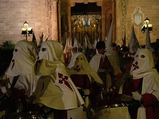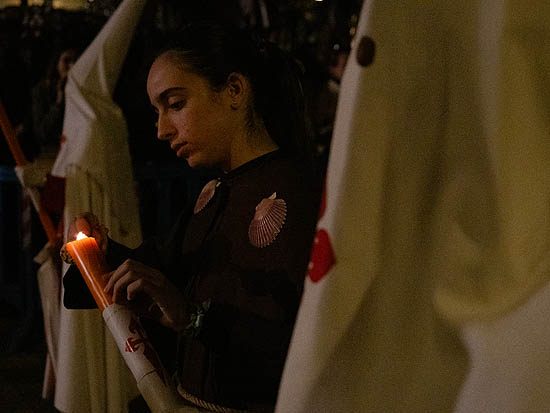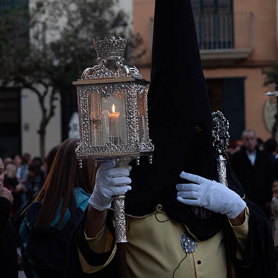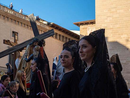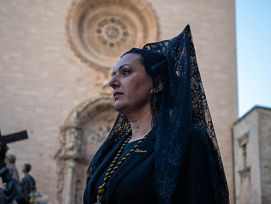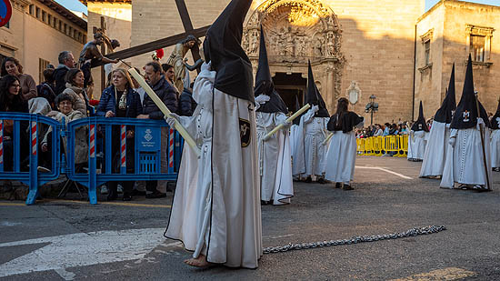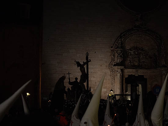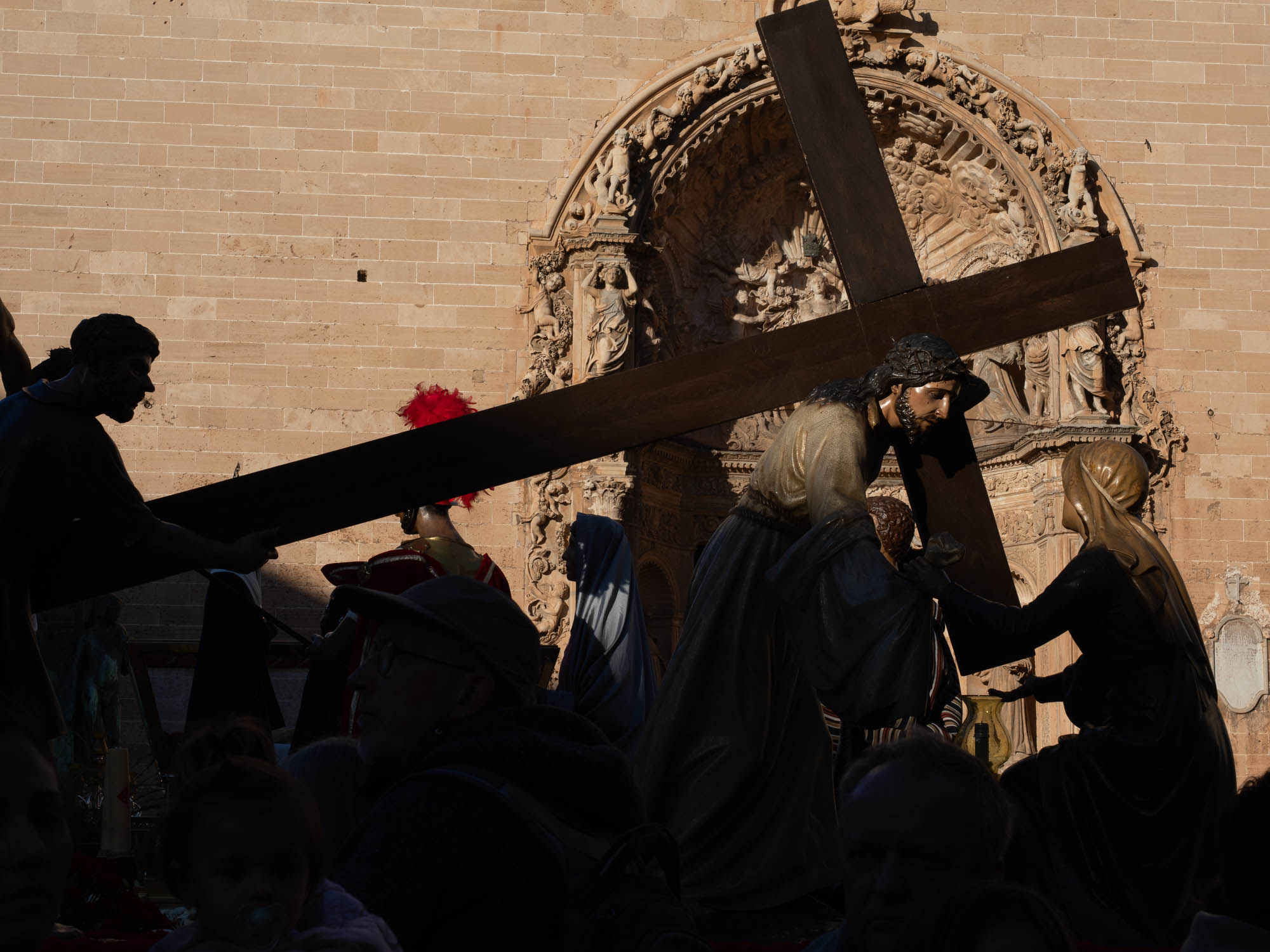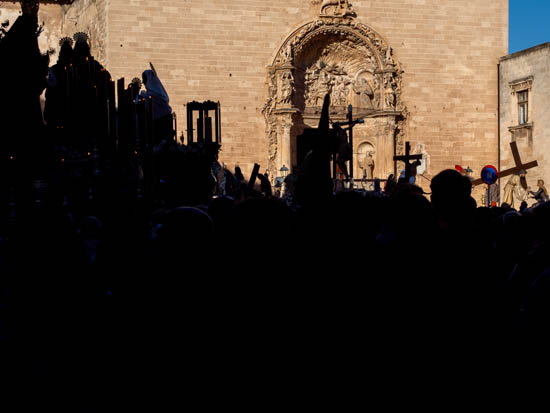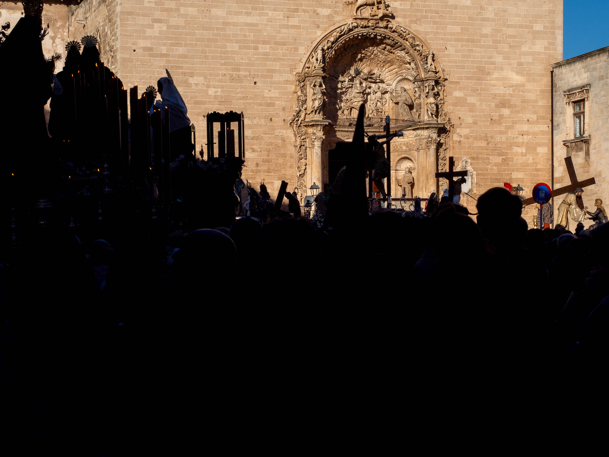 Stajemy przed bramą Sant Francesc, nad którą góruje posąg św. Jerzego nad dużym okrągłym witrażem. Procesja—Bolesna Matka, Chrystus leżący w kryształowej trumnie—czeka po jednej stronie placu, podczas gdy bractwa religijne powoli, bardzo powoli, opuszczają kościół. Deszczowa wiosna oczyściła powietrze, a jasnoniebieskie niebo stanowi wyraźny kontrast z ponurą liturgią. Ocherowa fasada kościoła staje się czerwona w blasku zachodzącego słońca. Stopniowo zapada ciemność.